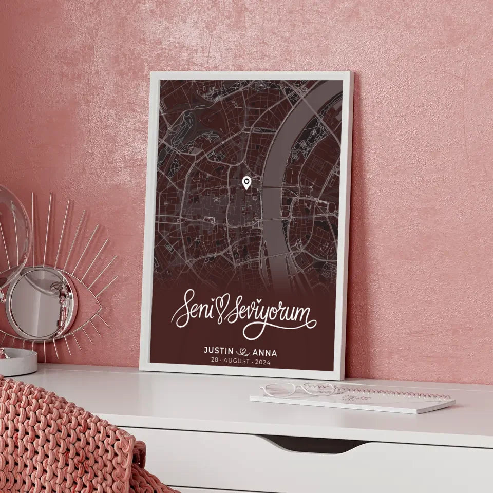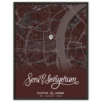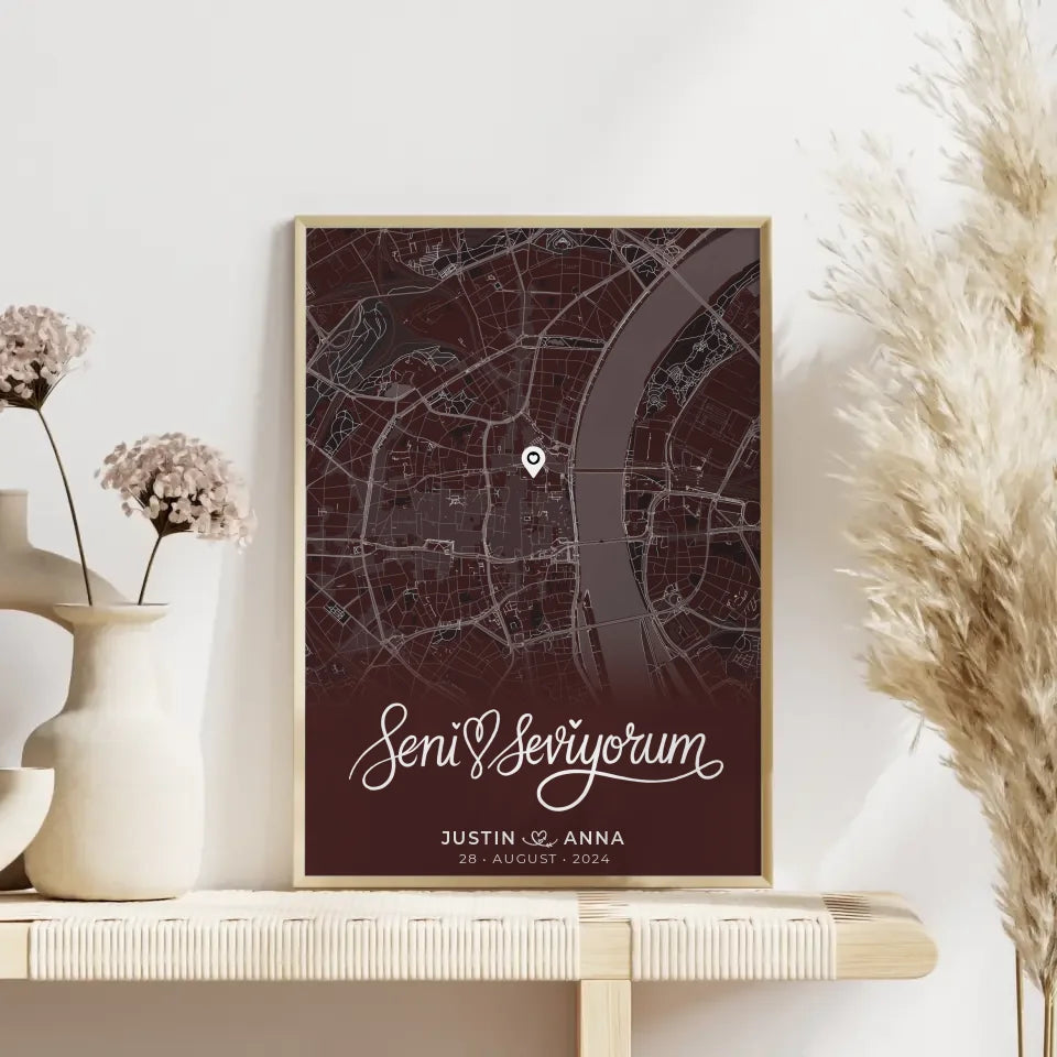 Entdecke das perfekte Geschenk: Personalisiertes Poster für Paare mit Stadtkarte Seni Seviyorum