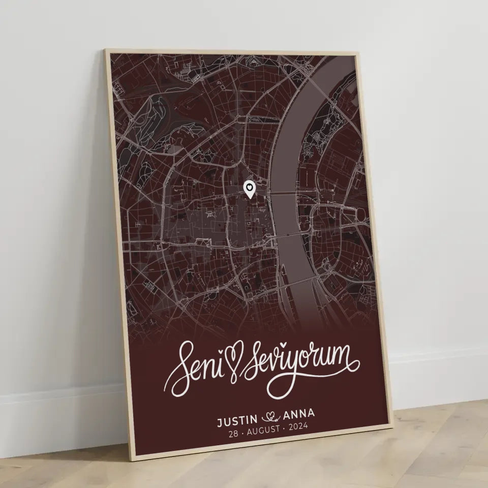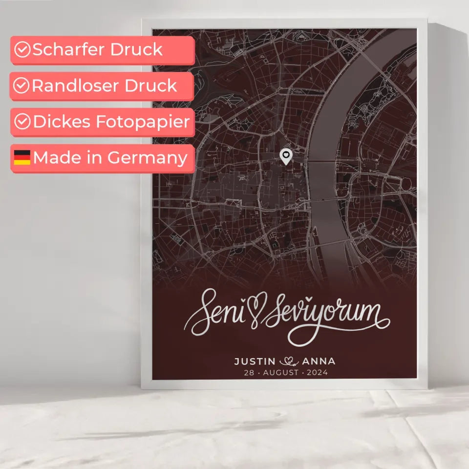 Personalisiertes Poster für Paare mit Stadtkarte Seni Seviyorum Geschenk