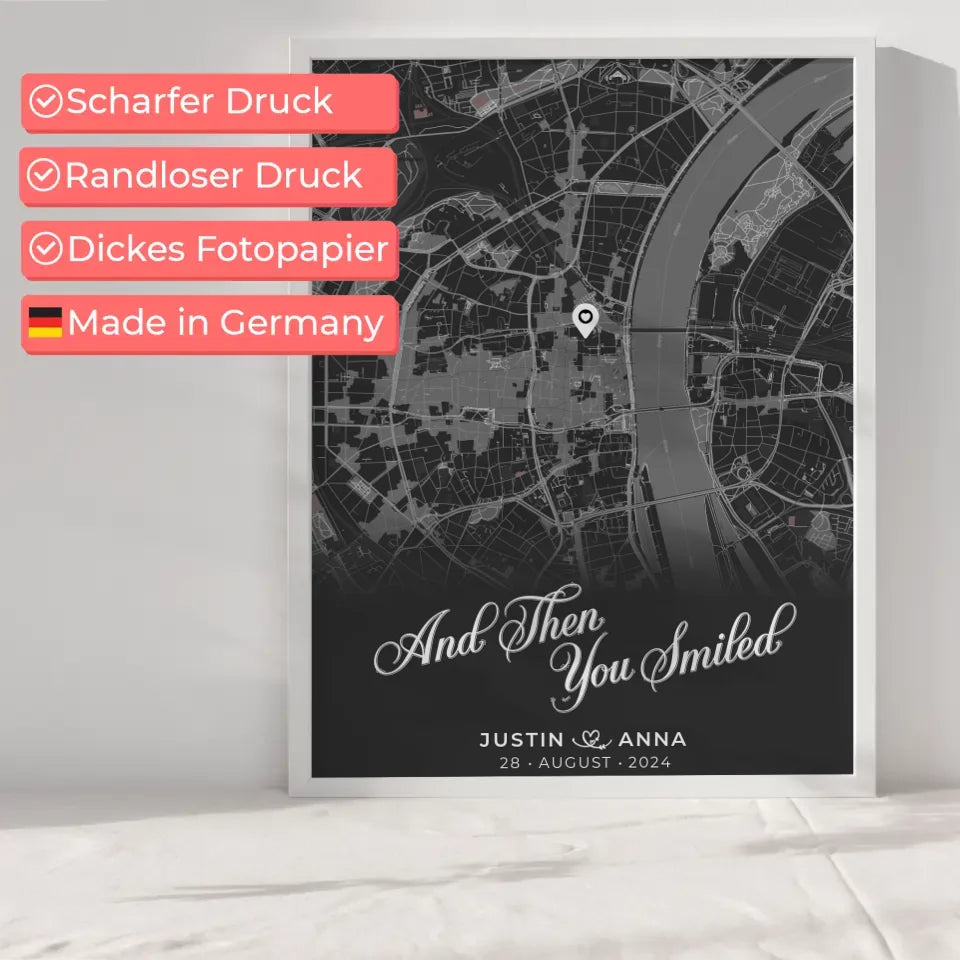 Suchst du nach einem besonderen Geschenk, das Herzen berührt? Unser personalisiertes Poster für Paare Stadtkarte Dunkelgrau All Of Me ist die perfekte Wahl! Dieses einzigartige Kunstwerk lässt sich individuell nach deinen Wünschen gestalten. Du kannst die Namen des Paares, ein bedeutendes Datum, eine Karte mit einem besonderen Ort sowie einen eigenen Spruch oder Wunschtext hinzufügen. Mit dem liebevollen Spruch 'All Of Me Loves All Of You' bringt es die tiefe Verbundenheit zwischen zwei Menschen zum Ausdruck.