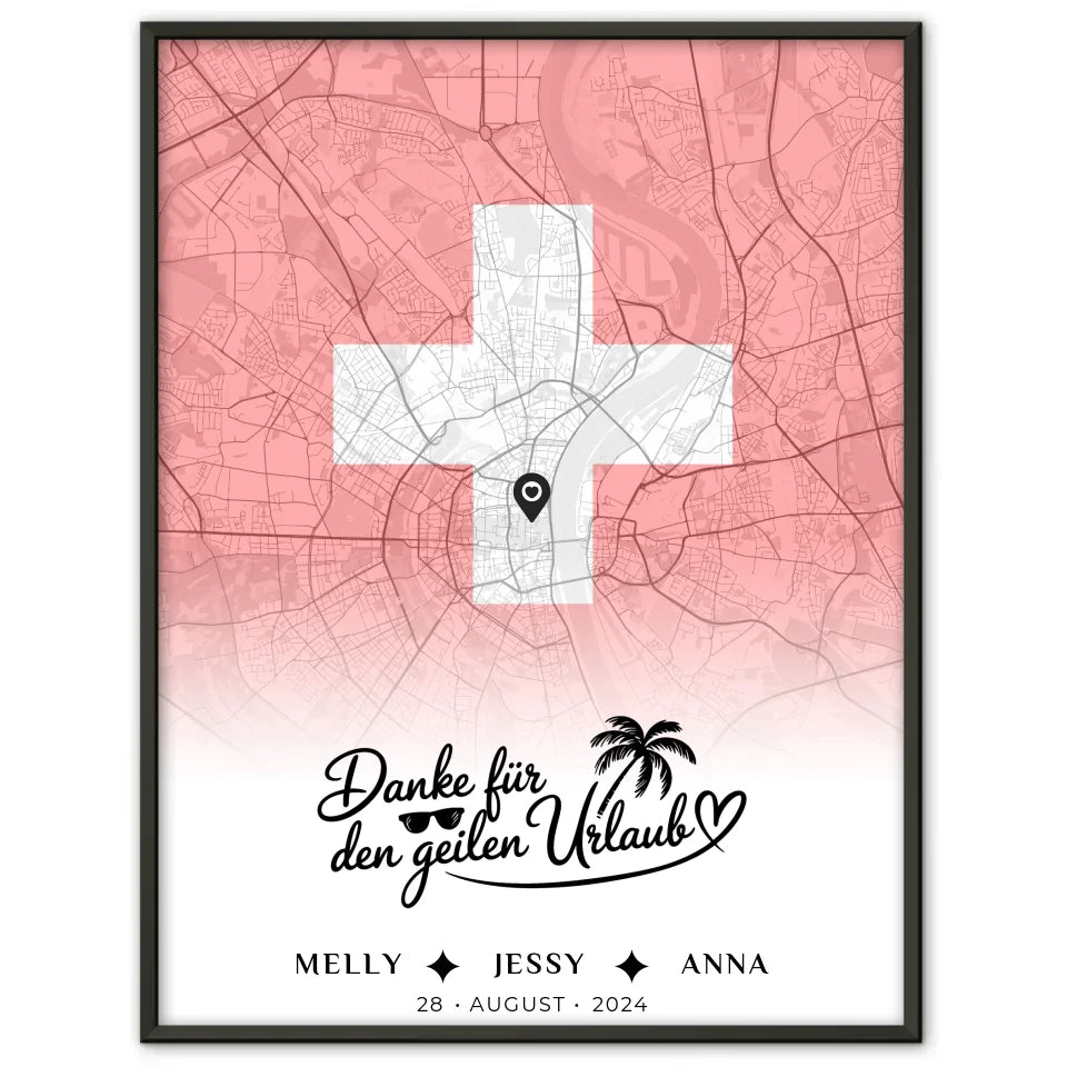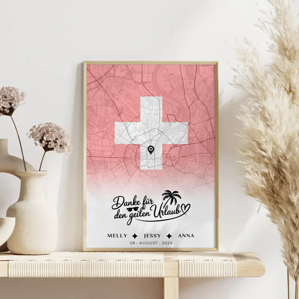 Suchst du nach einem einzigartigen Geschenk für deine Schwester? Dann ist das personalisierte Poster für Schwester Stadtkarte Schweiz Danke Für Den Geilen Urlaub genau das Richtige! Gestalte ein wunderschönes Kunstwerk, das Erinnerungen an euren unvergesslichen Urlaub in der Schweiz festhält.