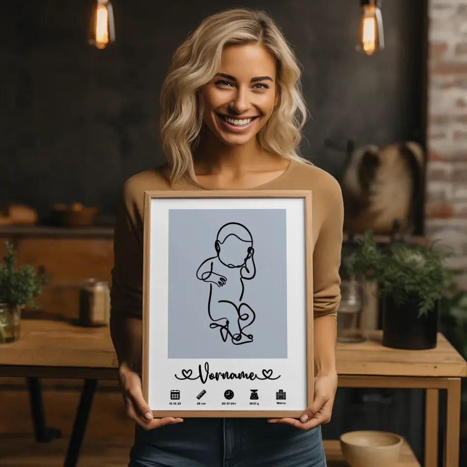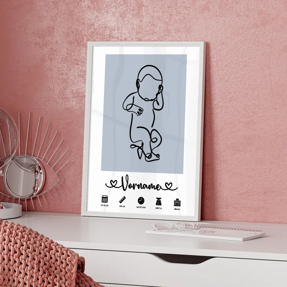 Gestalte dein individuelles Kunstwerk in einem sanften Azurblau und füge die wichtigsten Geburtsdaten hinzu. Mit der bezaubernden Baby Lineart wird das Poster nicht nur informativ, sondern auch ästhetisch ansprechend. Das personalisierte Poster ist ein einzigartiges Geschenk, das die Würde des Lebens feiert und jedes Kinderzimmer bereichert.