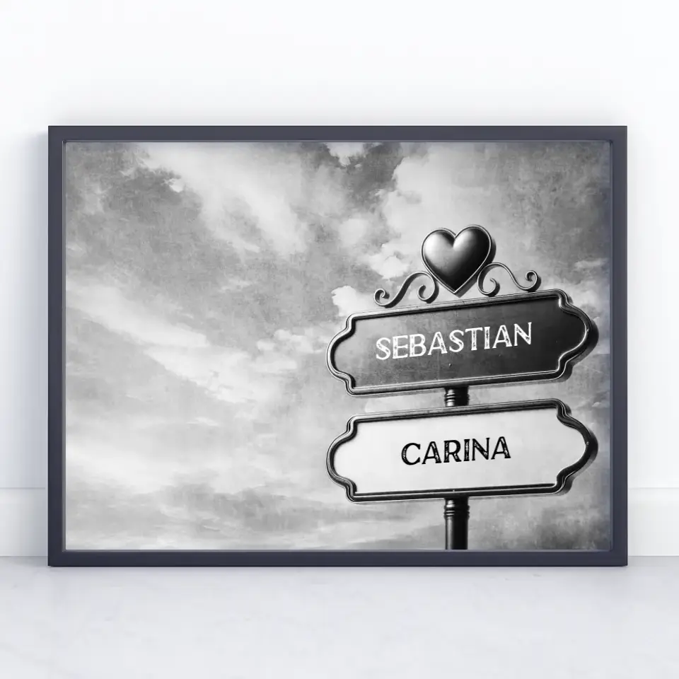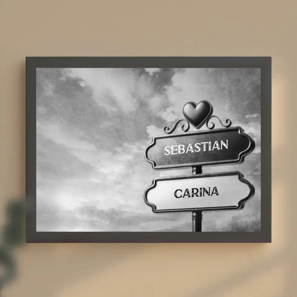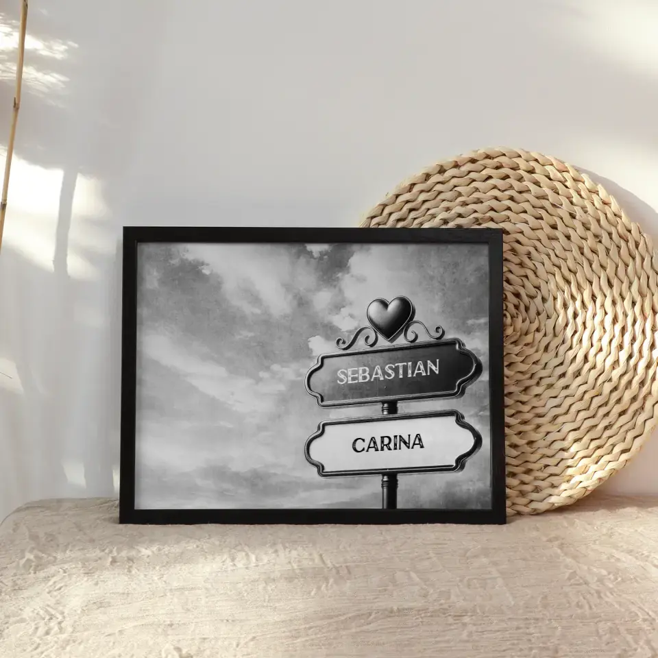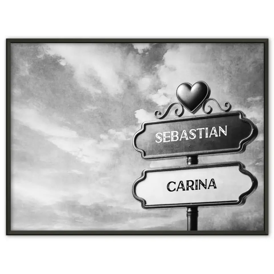 Unser Personalisiertes Poster Liebe Wegweiser Schwarz Weiß dicht bewölkt mit Namen