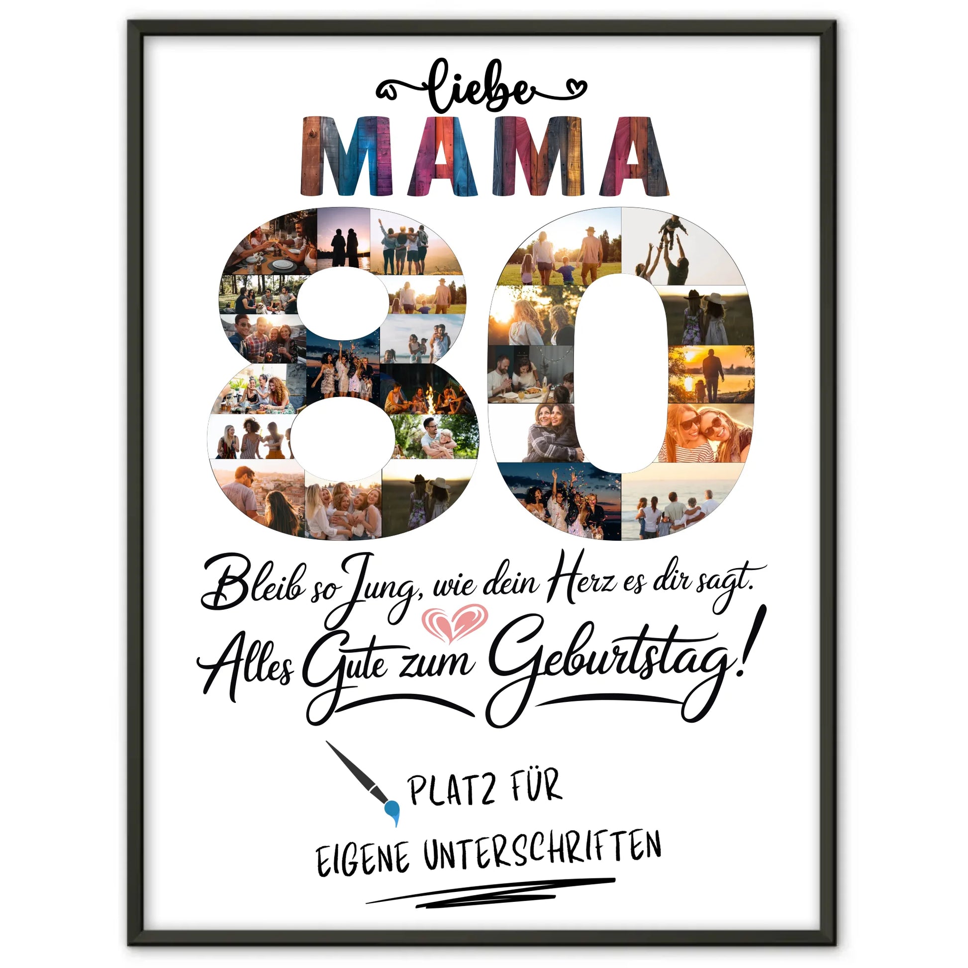 Feiere den 80. Geburtstag deiner Mama mit einem einzigartigen und personalisierten Geschenk, das Herzen berührt! Unser personalisiertes Poster Mama 80 Geburtstag mit Unterschriften Fotos ist die perfekte Geschenkidee, um deine Wertschätzung auszudrücken.
