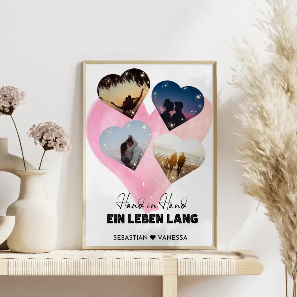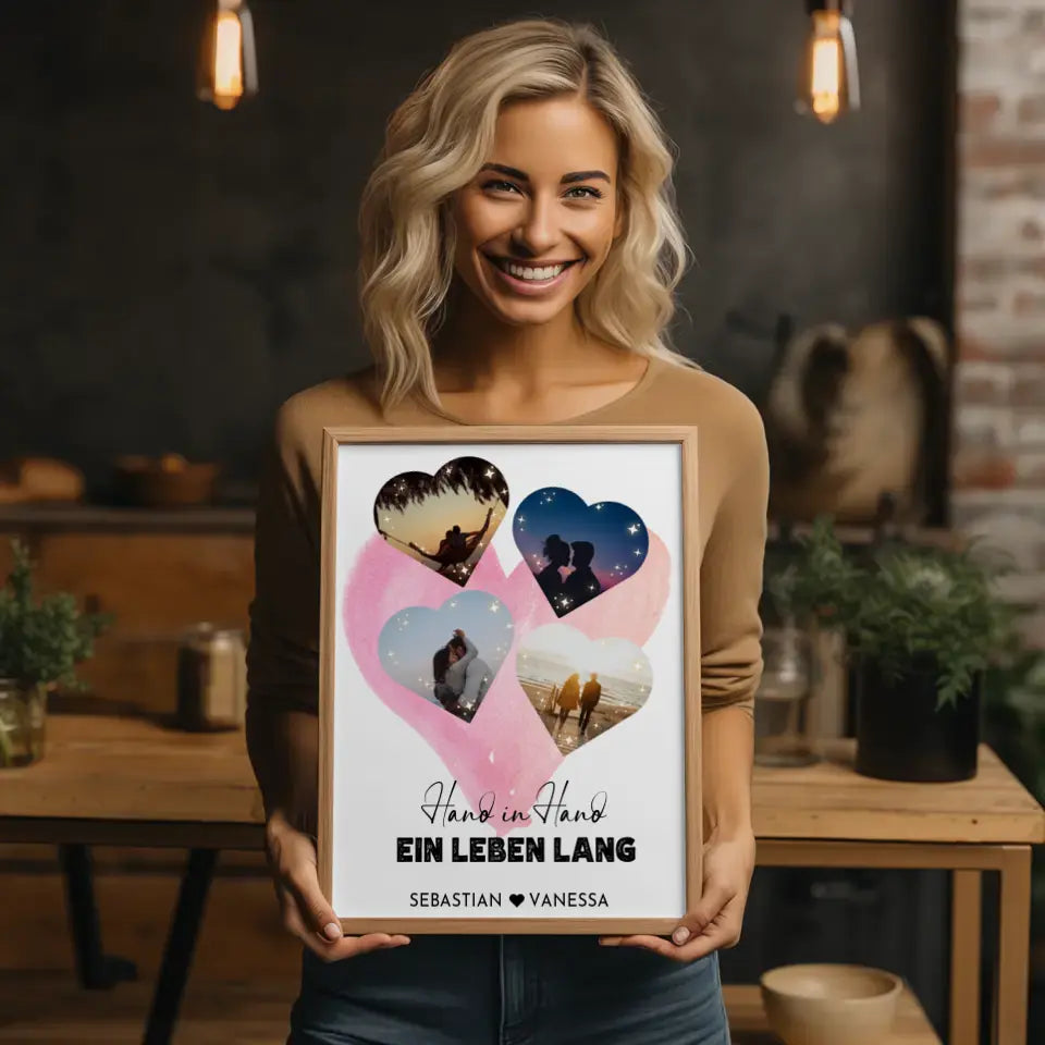 Personalisiertes Poster mit 4 Herzen Wasserfarben Hintergrund Mit Fotos & Namen