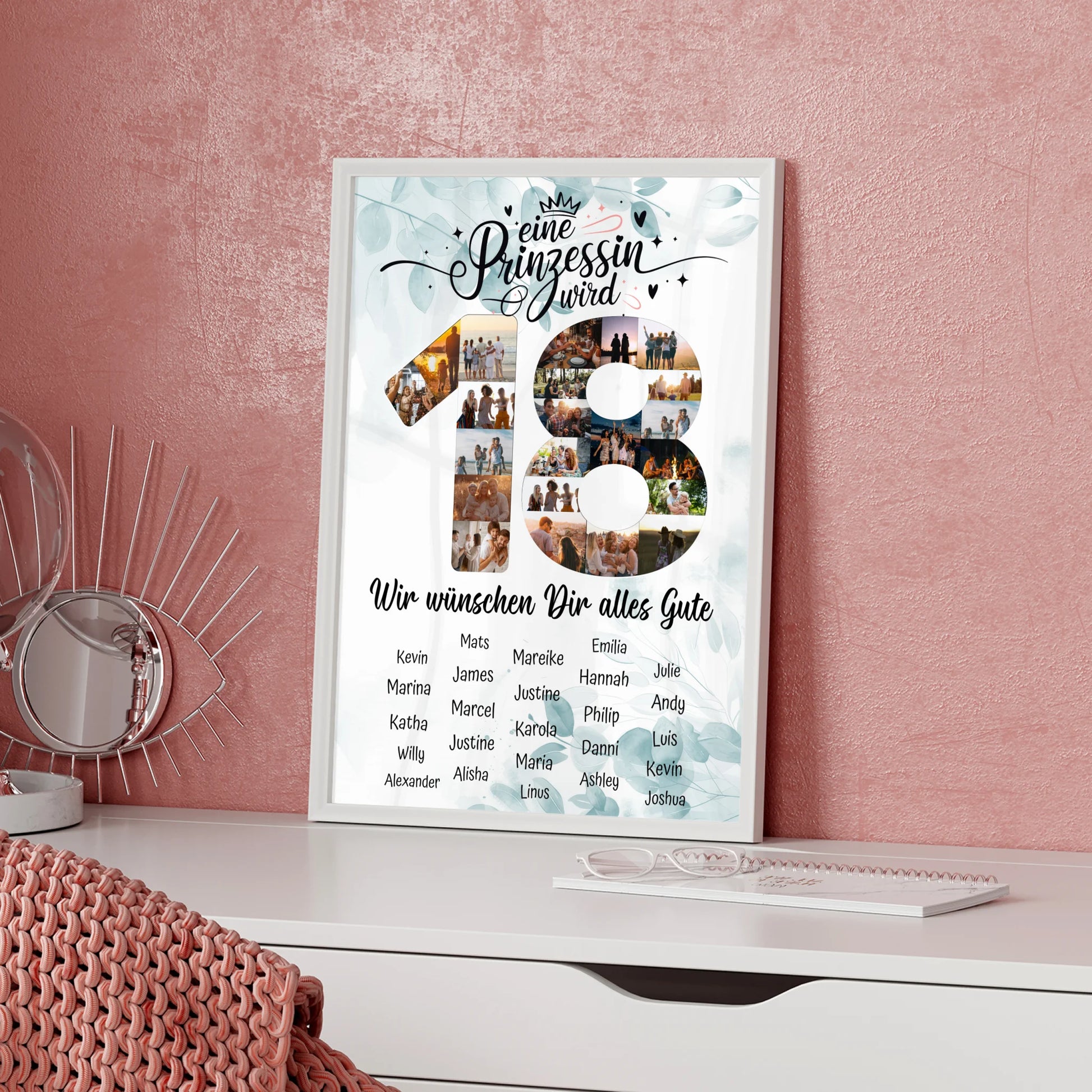 Feiere den besonderen 18. Geburtstag mit unserem personalisierten Poster mit Unterschriften 'Eine Prinzessin wird“. Dieses außergewöhnliche Geschenk wird garantiert zum Highlight jeder Feier und zaubert ein Lächeln auf das Gesicht des Geburtstagskindes.