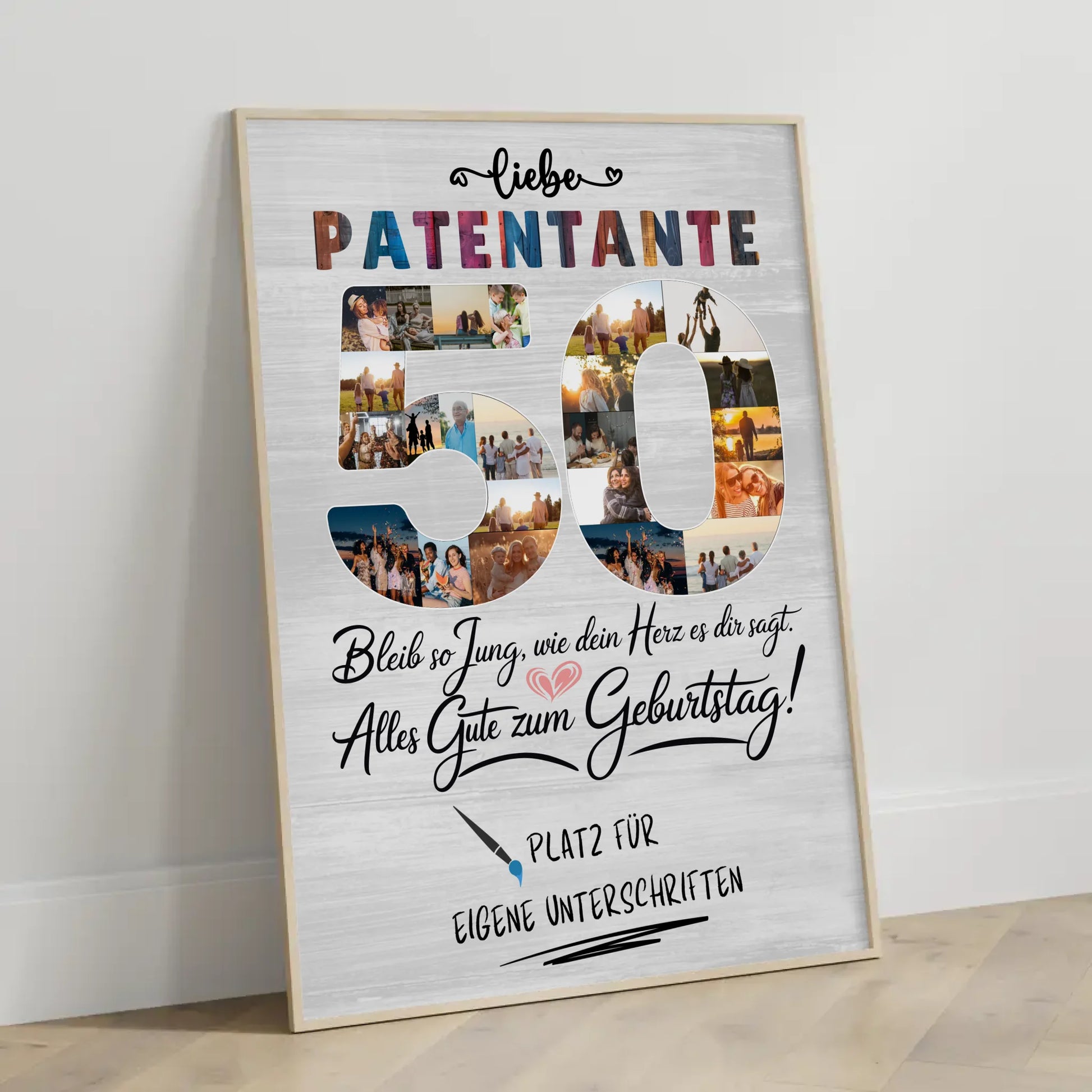 Überrasche deine Patentante an ihrem 50. Geburtstag mit einem einzigartigen und emotionalen Geschenk: dem personalisierten Poster mit Unterschriften. Dieses kreative Poster ermöglicht es dir, über 20+ Fotos auszuwählen, die wundervolle Erinnerungen festhalten, sowie einen eigenen Spruch oder Wunschtext hinzuzufügen. Damit wird dein Geschenk zu etwas ganz Besonderem!