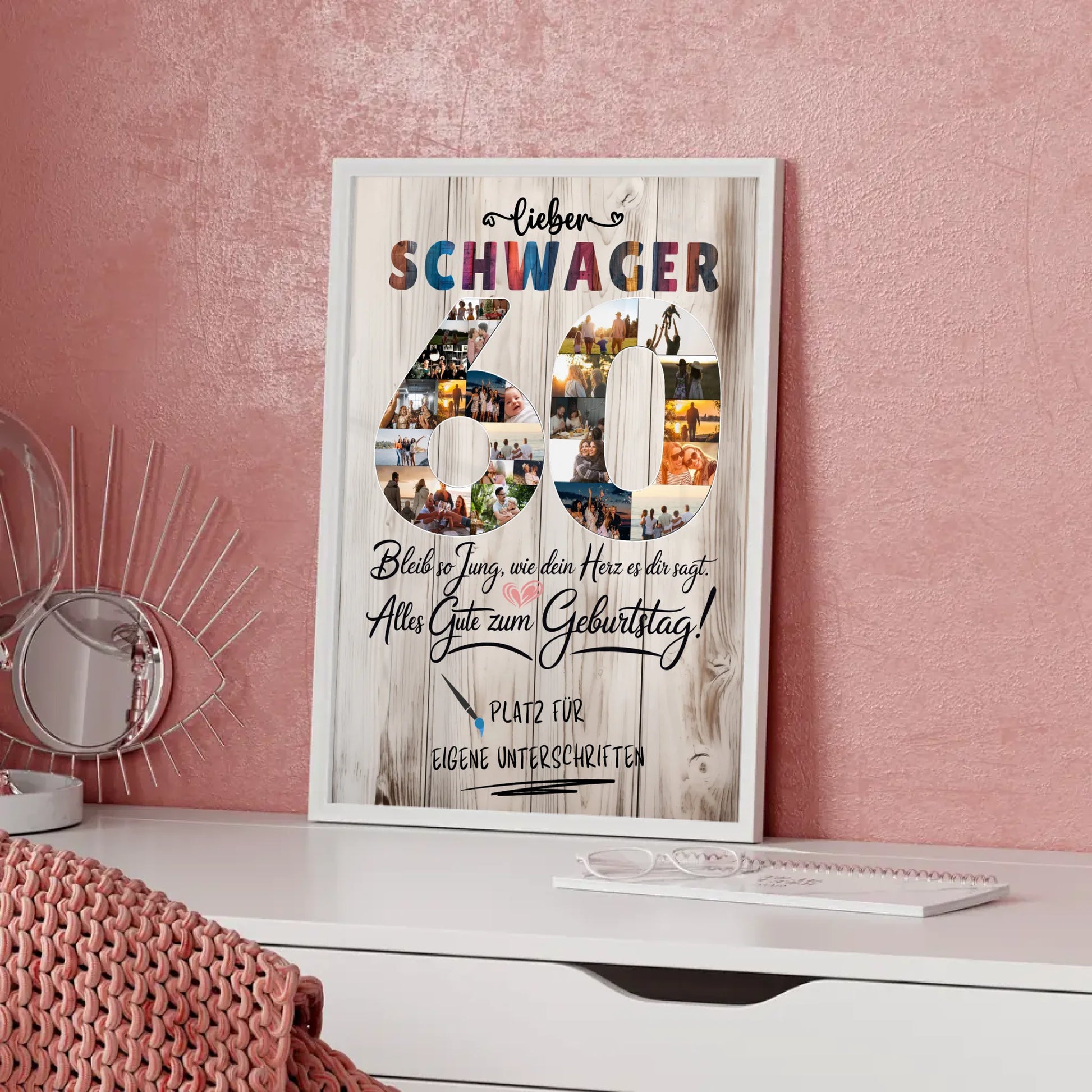 Mache den 60. Geburtstag zu einem unvergesslichen Erlebnis mit einem Geschenkvorschlag, der Herzen berührt und Erinnerungen weckt. Das personalisierte Poster ist eine großartige Geschenkidee und sorgt dafür, dass dein Schwager in jedem Alter jung bleibt. Bestelle noch heute dein individuelles Poster und feiere gemeinsam diesen besonderen Tag!
