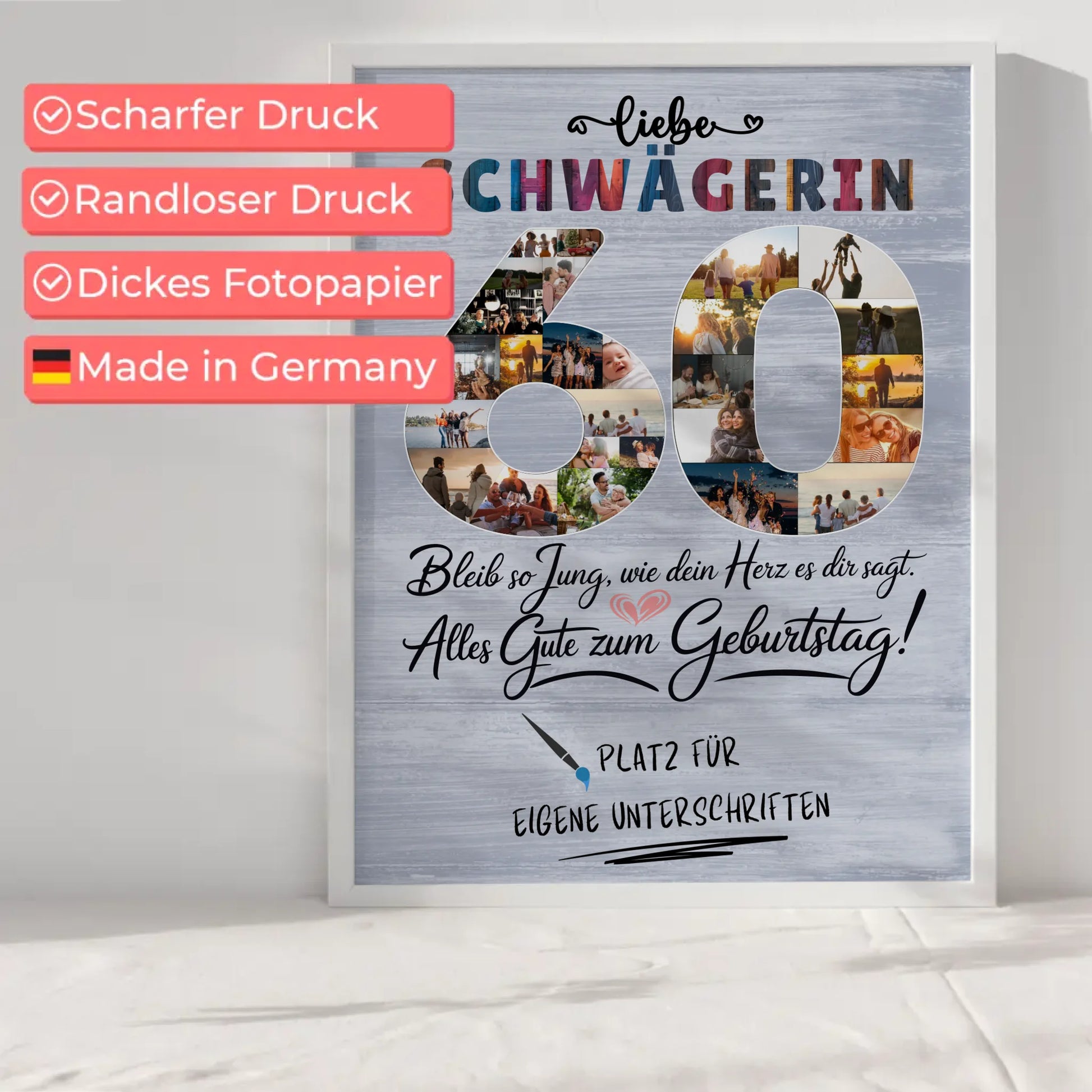 Suchst du nach einer einzigartigen Geschenkidee für den 60. Geburtstag deiner Schwägerin? Mit unserem personalisierten Poster mit Unterschriften machst du ihr garantiert eine Freude! Dieses außergewöhnliche Geschenk bietet dir die Möglichkeit, über 20+ Fotos, einen eigenen Spruch oder Wunschtext sowie Namen oder eigene Unterschriften hinzuzufügen. So kreierst du ein ganz persönliches Kunstwerk, das euer gemeinsames Verhältnis perfekt widerspiegelt.