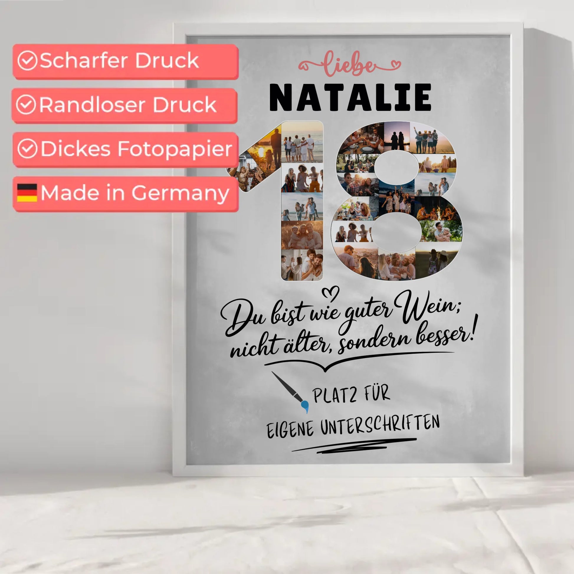 Überrasche das Geburtstagskind mit einem einzigartigen Geschenk: unserem personalisierten Poster mit Unterschriften zum 18. Geburtstag, mit Fotos und Wunschname! Dieses individuell gestaltbare Poster ist das perfekte Andenken, um diesen besonderen Tag unvergesslich zu machen. Du kannst aus über 20+ Fotos wählen, deinen eigenen Spruch oder Wunschtext hinzufügen sowie Namen oder eigene Unterschriften integrieren. Das Design wird durch den inspirierenden Spruch 'Nicht älter Besser' ergänzt und macht es zu einem absoluten Hingucker!
