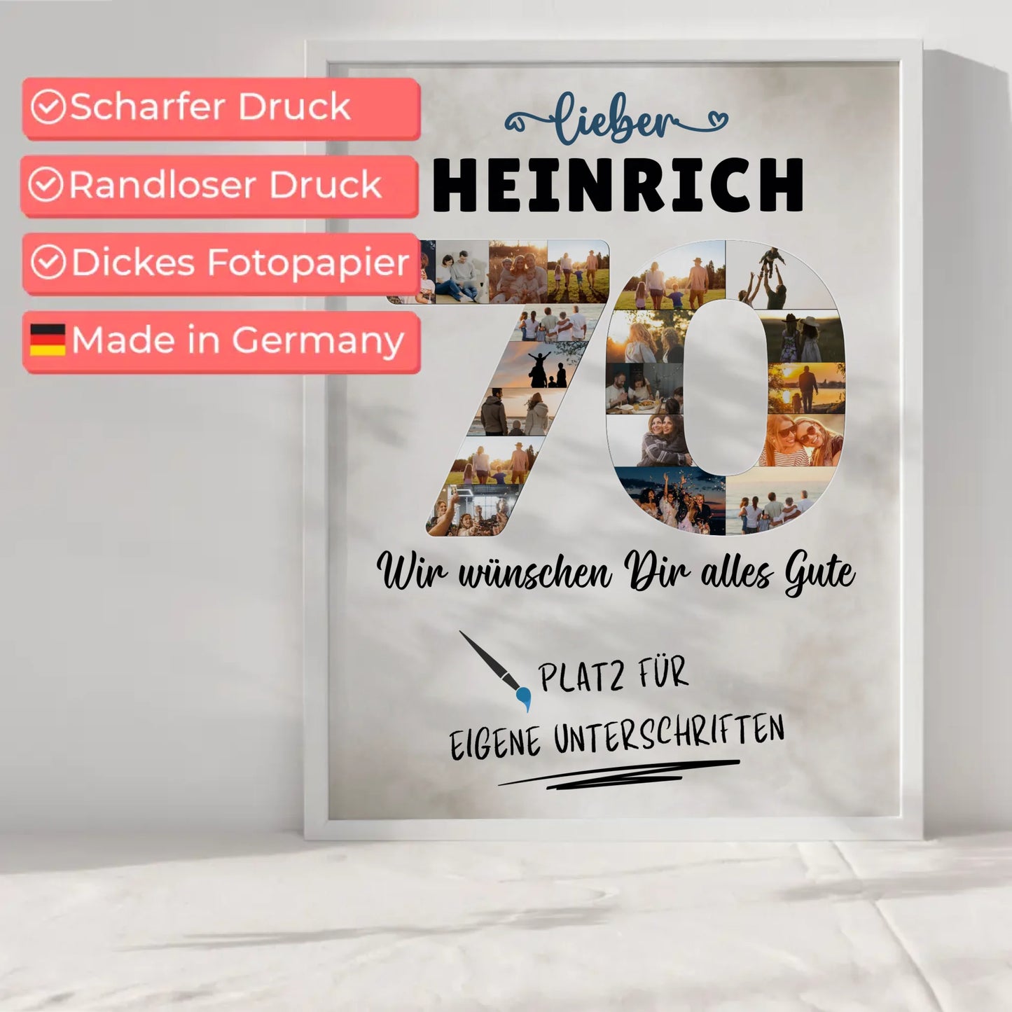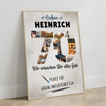 Suchst du nach einem einzigartigen und persönlichen Geschenk? Unser personalisiertes Poster mit Wunschtext zum 70. Geburtstag ist die ideale Wahl, um deinem Opa oder Papa eine ganz besondere Freude zu machen. Mit diesem individuellen Kunstwerk kannst du mehr als 20+ Fotos einfügen und gleichzeitig einen eigenen Spruch oder Wunschtext hinzufügen, der von Herzen kommt.