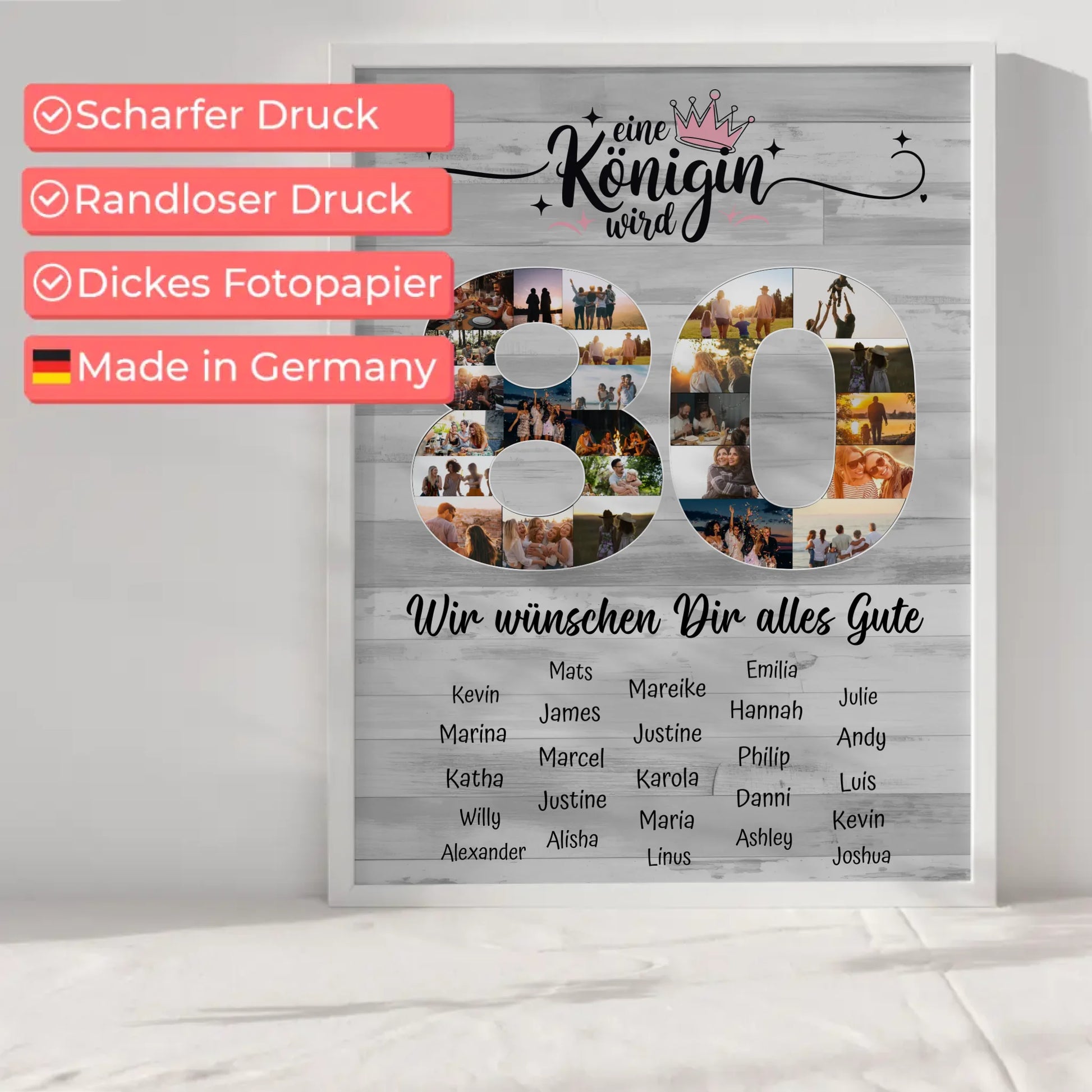Suchst Du nach dem perfekten Geschenk für den 80. Geburtstag einer wunderbaren Frau in Deinem Leben? Dann ist das personalisierte Poster mit Wunschtext '80 Geburtstag Eine Königin' genau das Richtige! Dieses einzigartige Poster bietet Dir die Möglichkeit, über 20+ Fotos hinzuzufügen und einen eigenen Spruch oder Wunschtext zu gestalten, der von Herzen kommt.