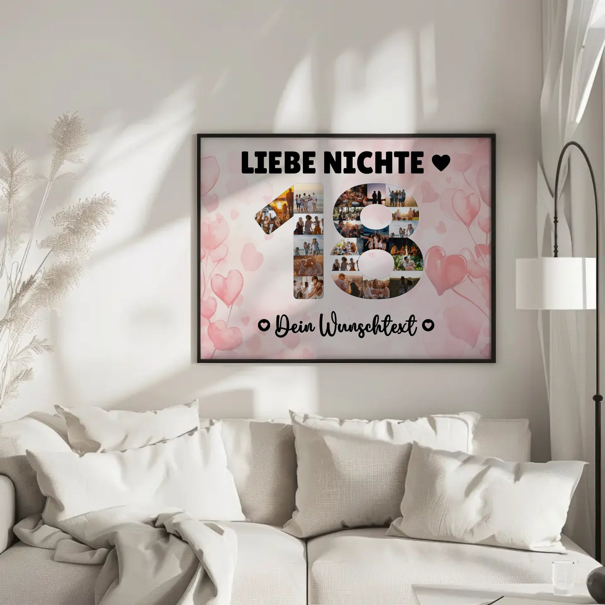 Verwandle Erinnerungen in Kunstwerke und kreiere ein personalisiertes Poster, das nicht nur im Schlafzimmer oder Wohnzimmer großartig aussieht, sondern auch dauerhaft in Erinnerung bleibt. Bestelle jetzt dein Poster mit Wunschtext und mache den 18 Geburtstag deiner Nichte unvergesslich!