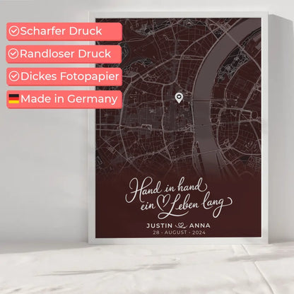 Gönne Dir und Deinem Partner unvergessliche Erinnerungen mit unserem **personalisierten Poster Paare Stadtkarte Hand In Hand**. Jetzt bestellen und das perfekte Geschenk für Euren besonderen Anlass kreieren!