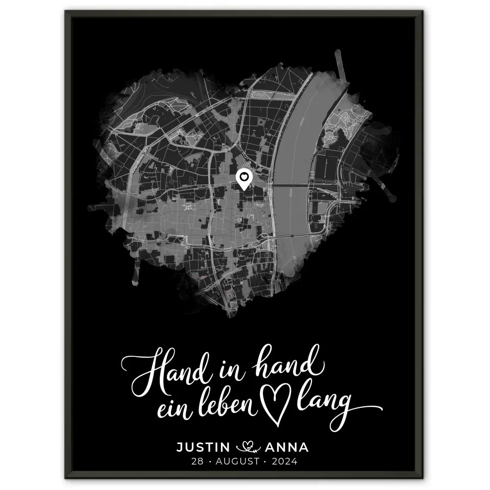 Sichere dir jetzt dein personalisiertes Poster Paare Stadtkarte Herzform Hand In Hand Ein Leben Lang und verschenke Emotionen in Form von Kunst. Perfekt für alle, die das Besondere lieben!