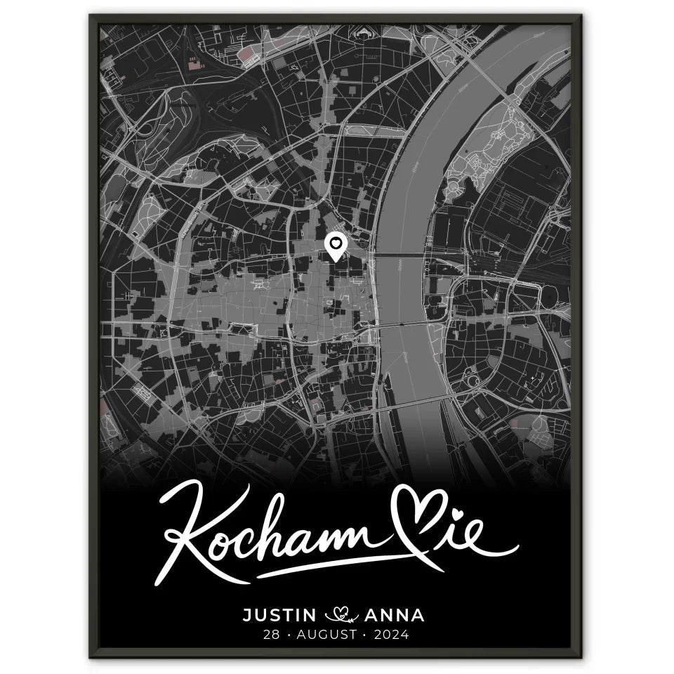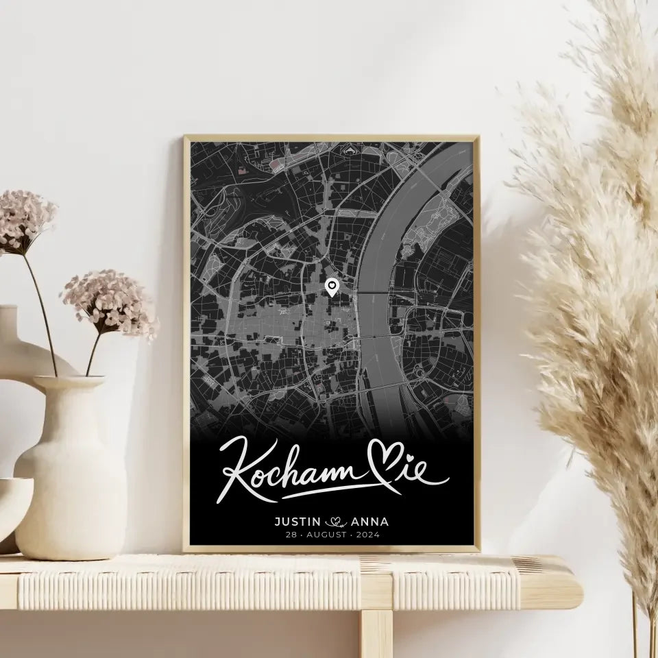 Suchst du nach einem einzigartigen Geschenk für deinen Lieblingsmenschen? Das 'Personalisiertes Poster Paare Stadtkarte Schwarz Kocham Cie Wo alles begann' ist die perfekte Wahl! Gestalte dieses stilvolle Poster nach deinen Wünschen und personalisiere es mit den Namen des Paares, einem bedeutenden Datum und einer Stadtkarte des Ortes, an dem alles begann. Der liebevolle Spruch 'Kocham Cie' rundet das Design ab und vermittelt die besondere Verbindung zwischen euch.