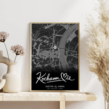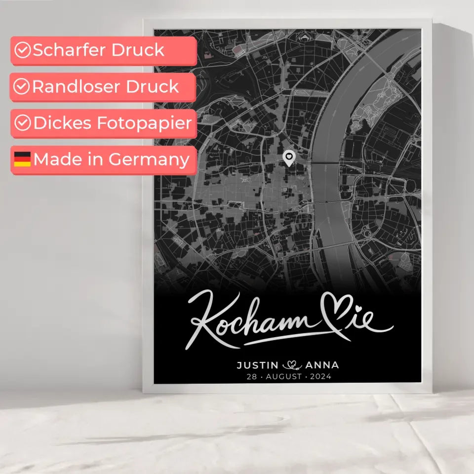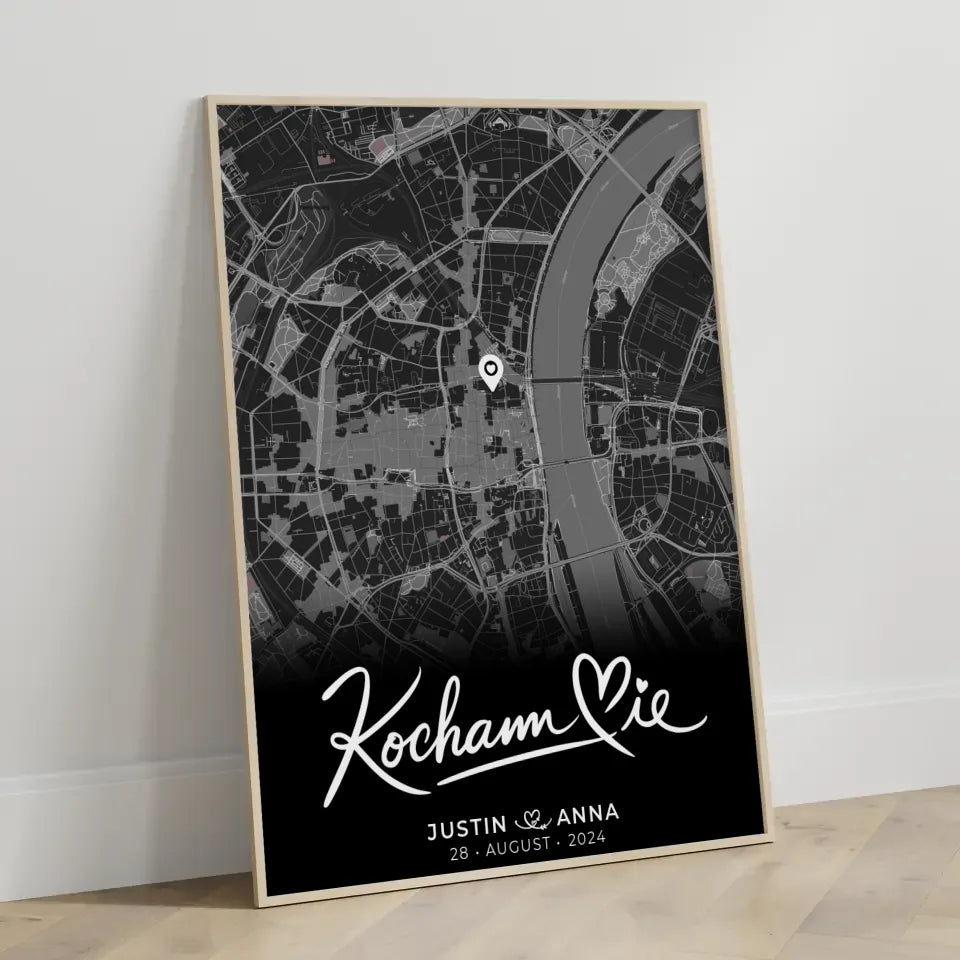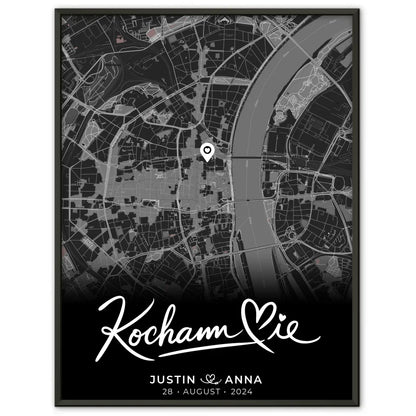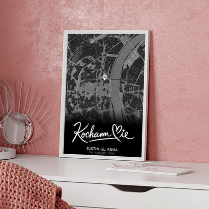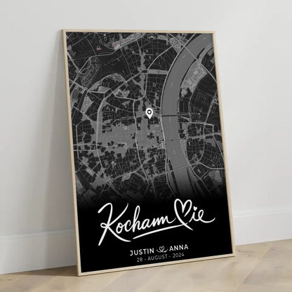 Entdecke das personalisierte Poster 'Personalisiertes Poster Paare Stadtkarte Schwarz Kocham Cie Wo alles begann'