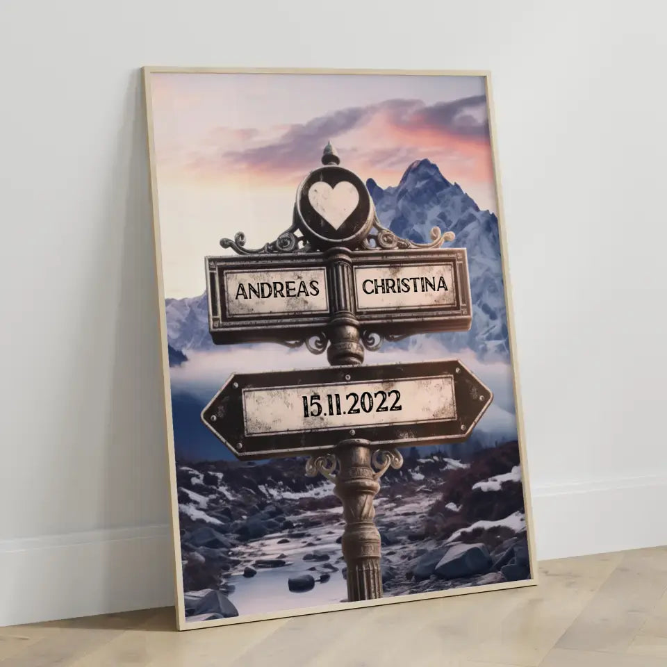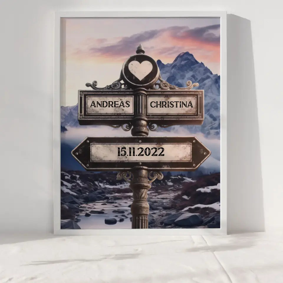 Unser Personalisiertes Poster Paare Wegweiser Bergfluss Winter mit Namen & Datum