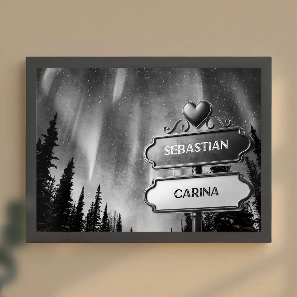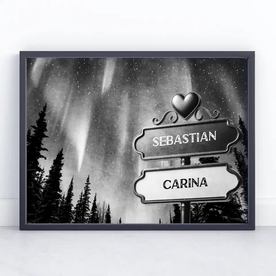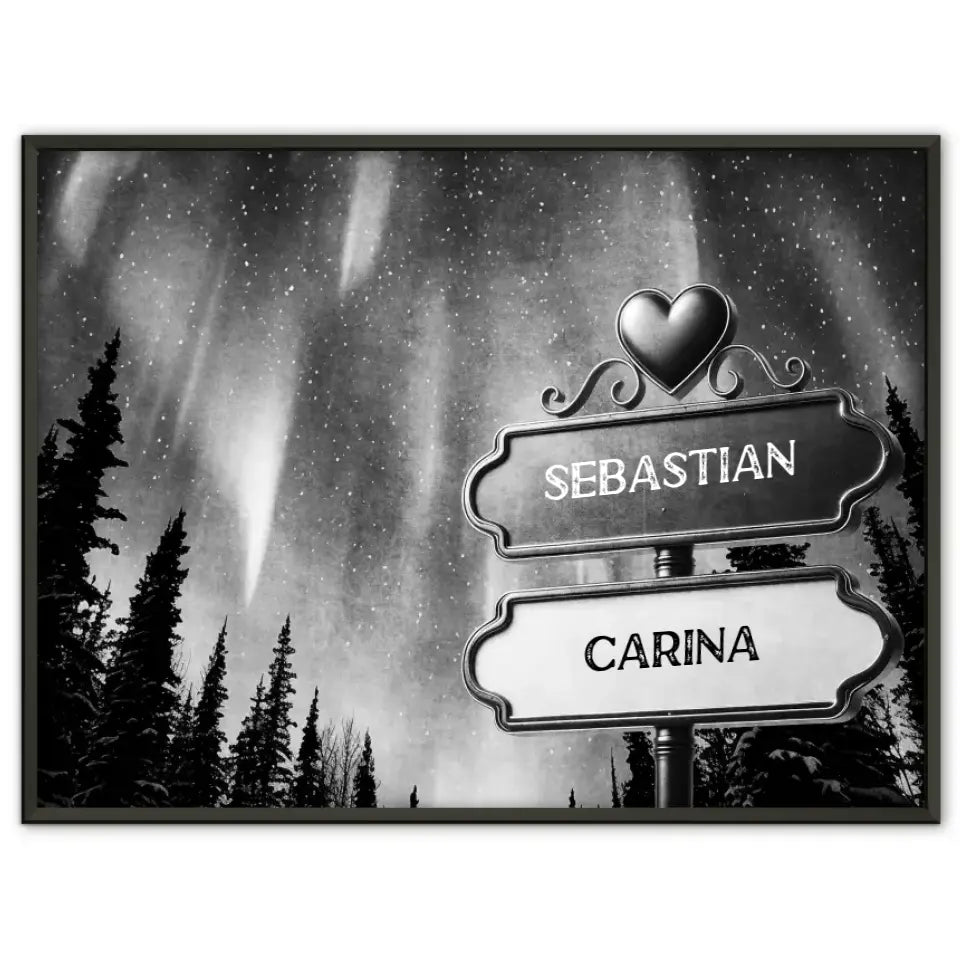 Unser Personalisiertes Poster Paare Wegweiser Schwarz Weiß Himmel Nordlichter