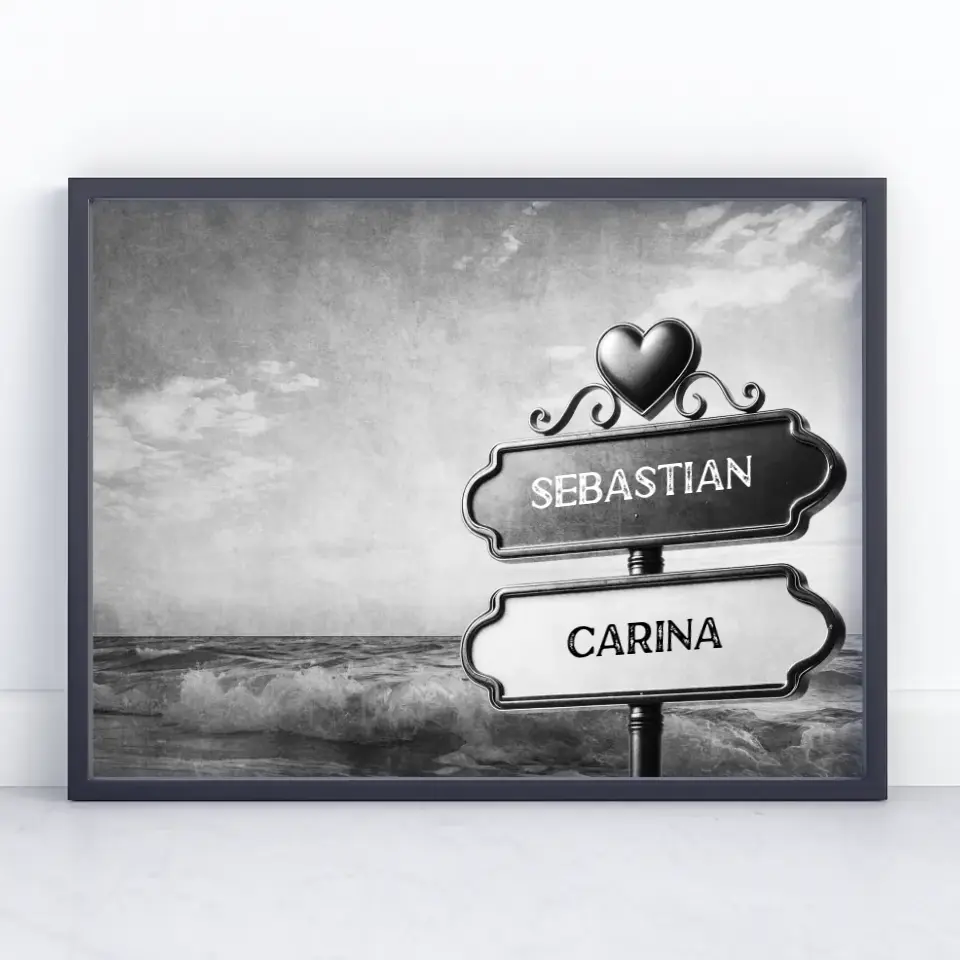 Du möchtest mal wieder etwas einzigartiges verschenken? unser Personalisiertes Poster Paare Wegweiser Schwarz Weiß Wellen mit Namen das perfekte personalisierbare Geschenk.