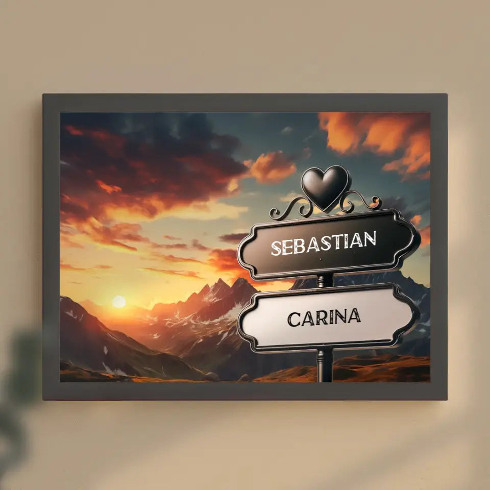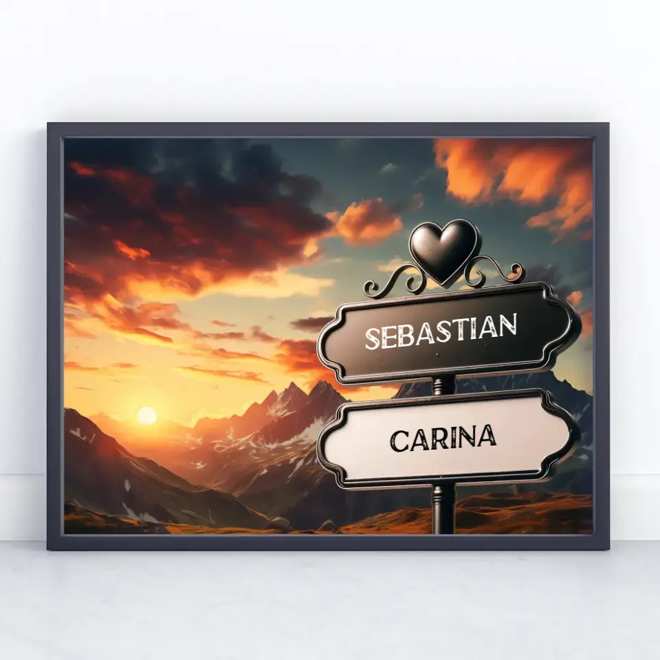 Personalisiertes Poster Paare Wegweiser Sonnenuntergang Alpen mit Namen