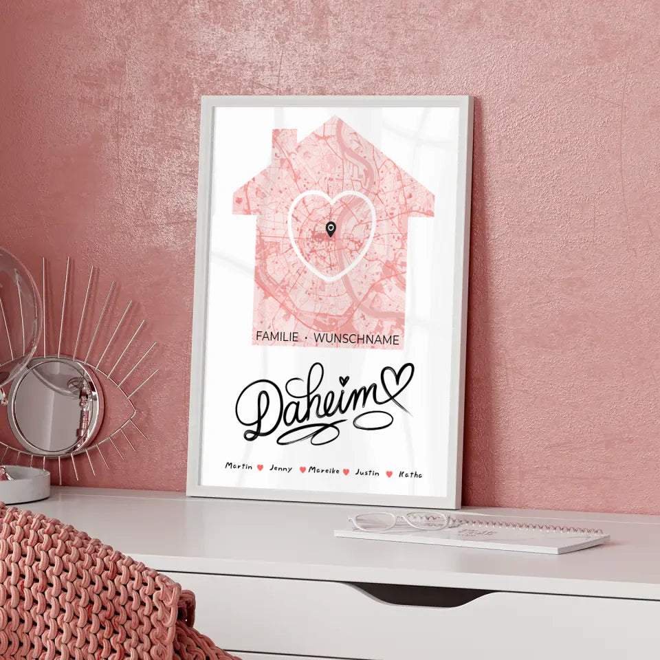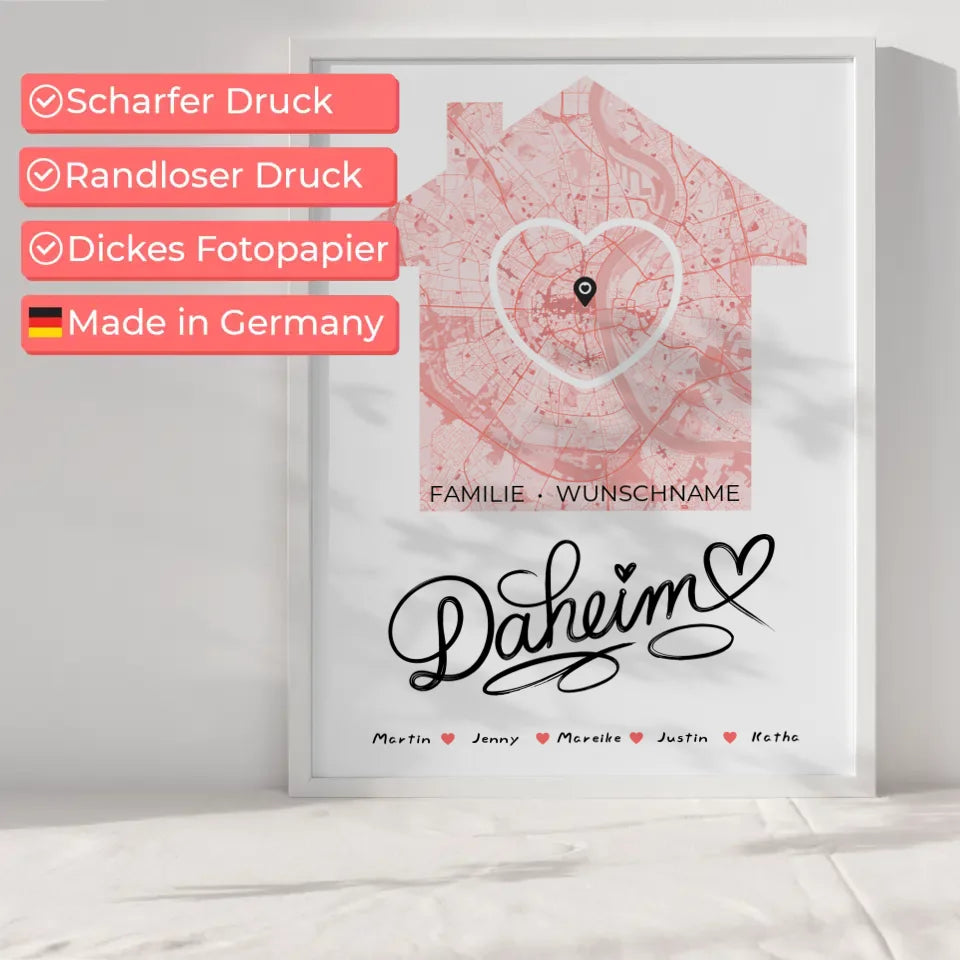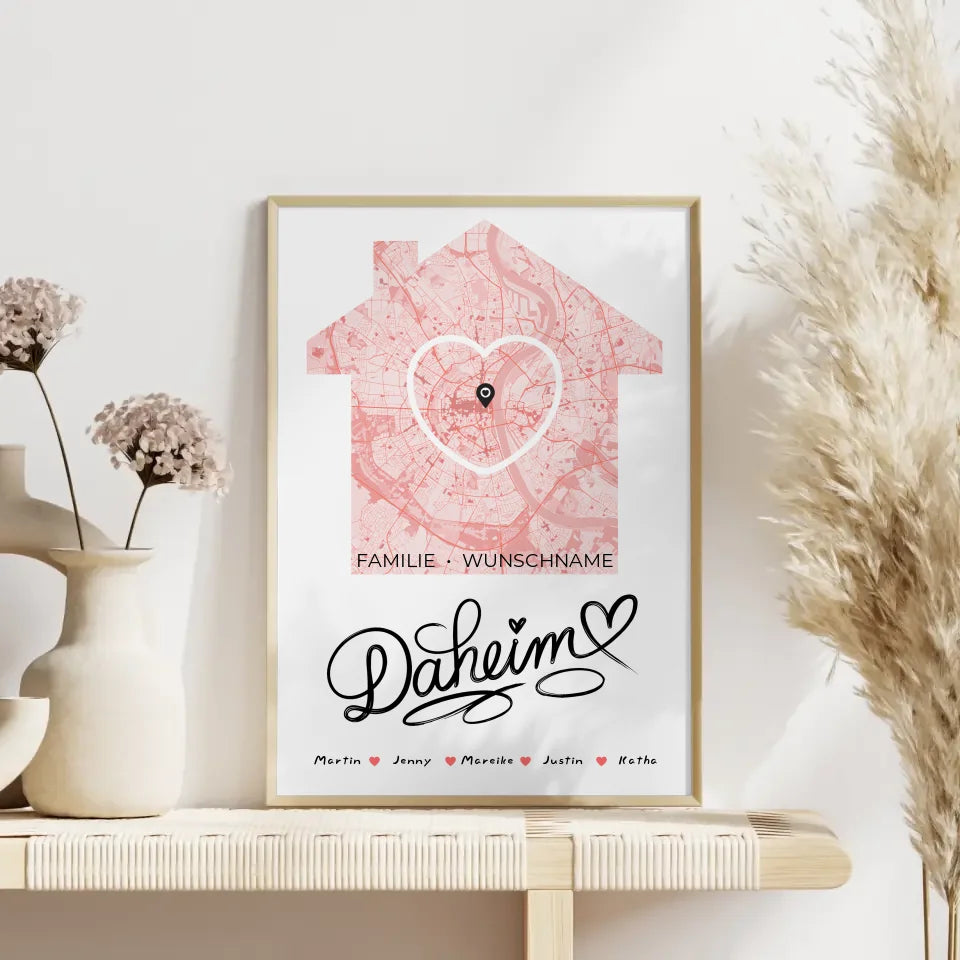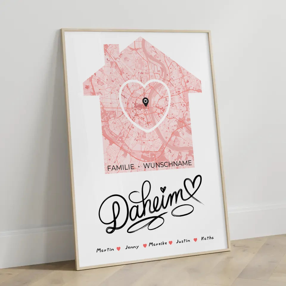 Verleihe Deinem Zuhause das besondere Etwas mit unserem personalisierten Poster. Mach es zu einem Teil Deiner Familie und lass es zum Mittelpunkt Deiner Wohnung werden. Schaffe Erinnerungen, die bleiben - mit dem personalisierten Poster Spruch Familie, einer Stadtkarte von 'Daheim' und dem Nachnamen Deiner Wahl.