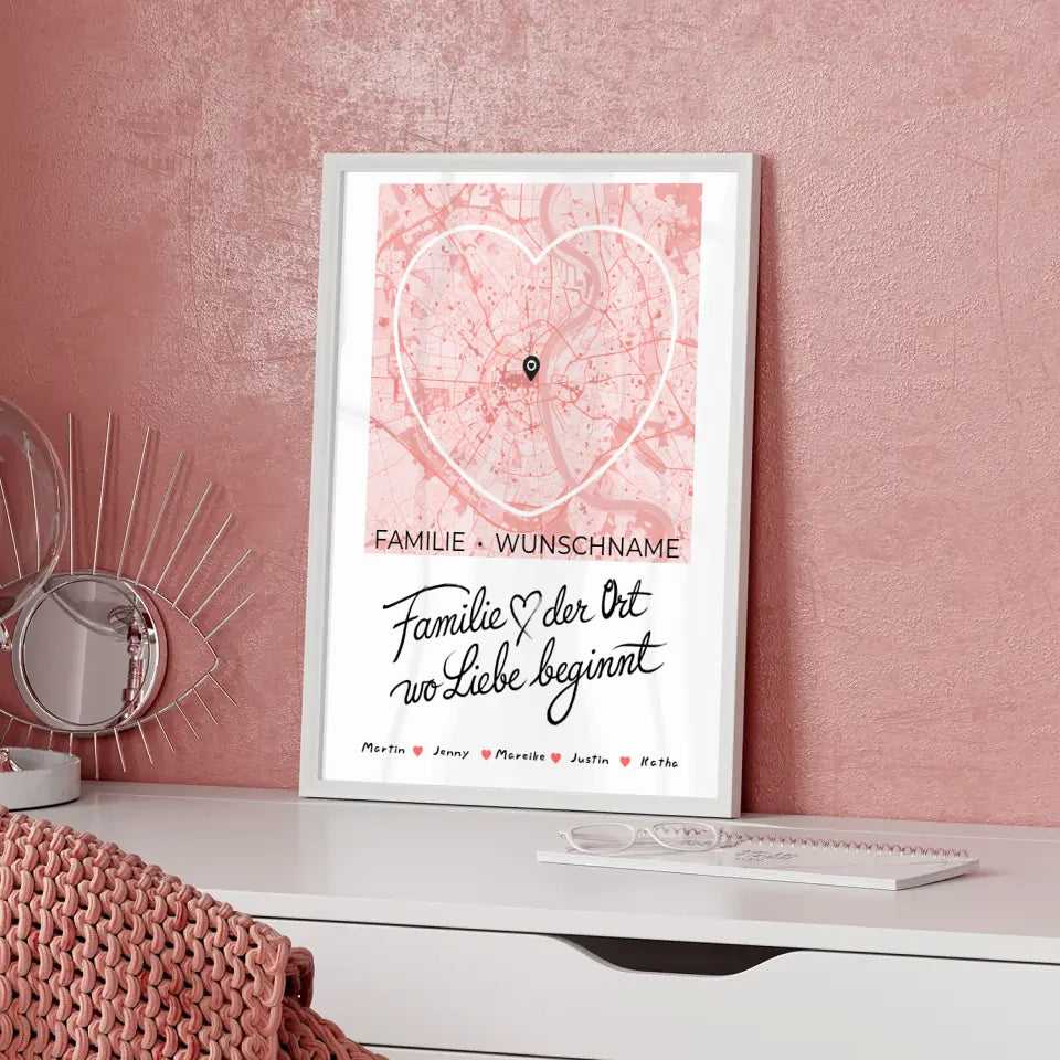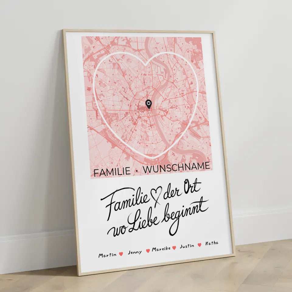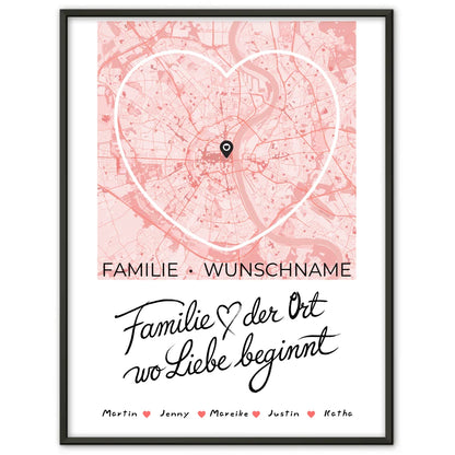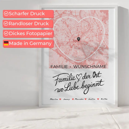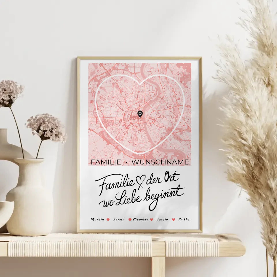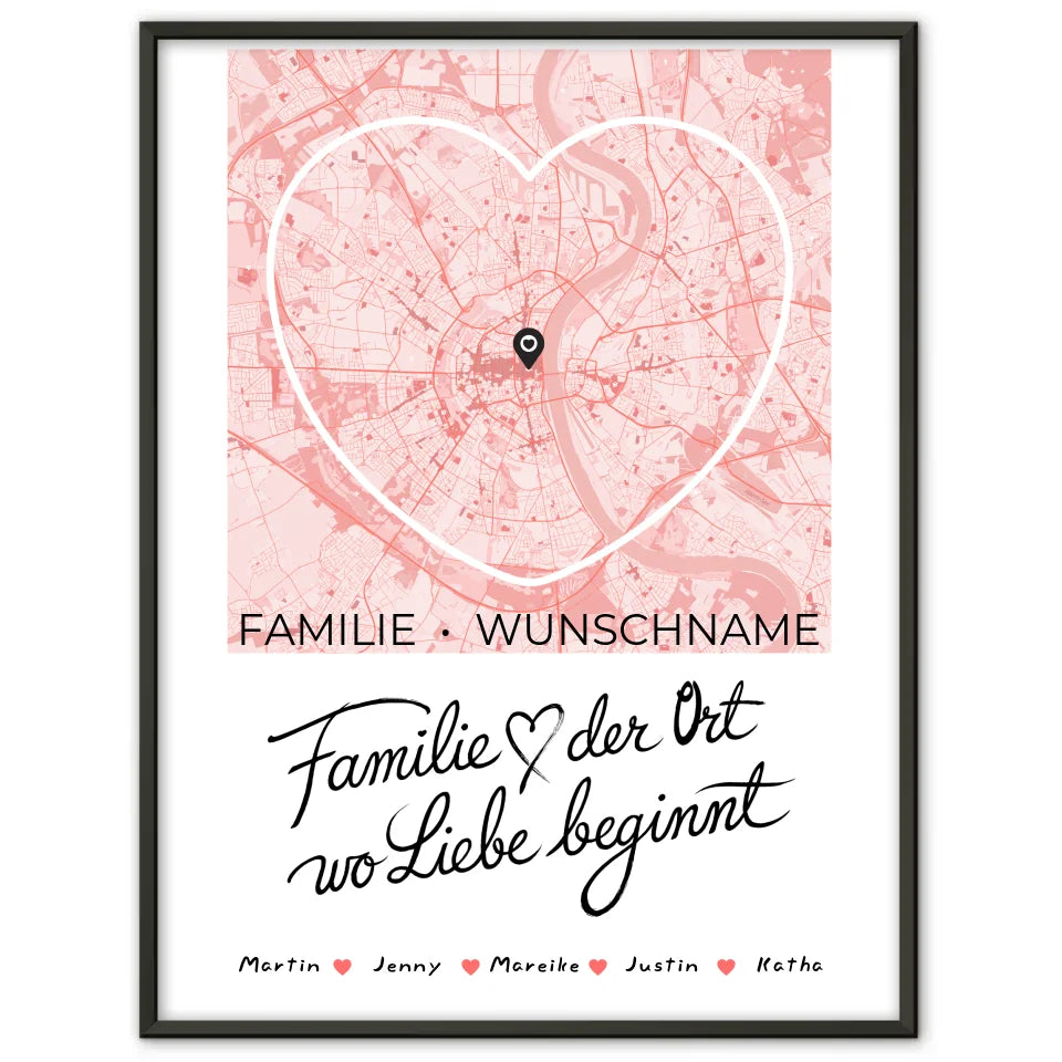 Personalisiertes Poster Spruch Familie Stadtkarte Wo Liebe beginnt Herzform mit Nachname