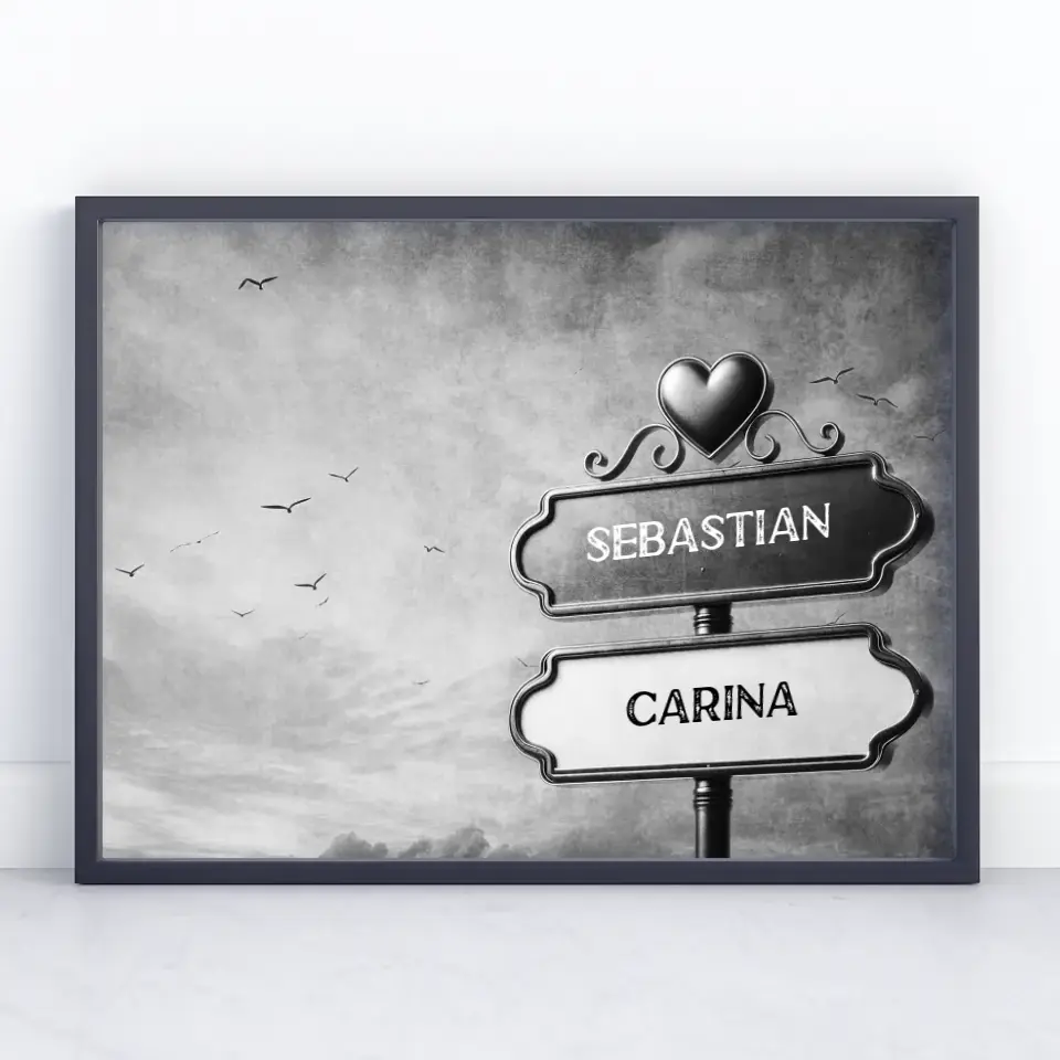 Personalisiertes Poster Wegweiser Schwarz Weiß Vögel bewölkt mit Namen