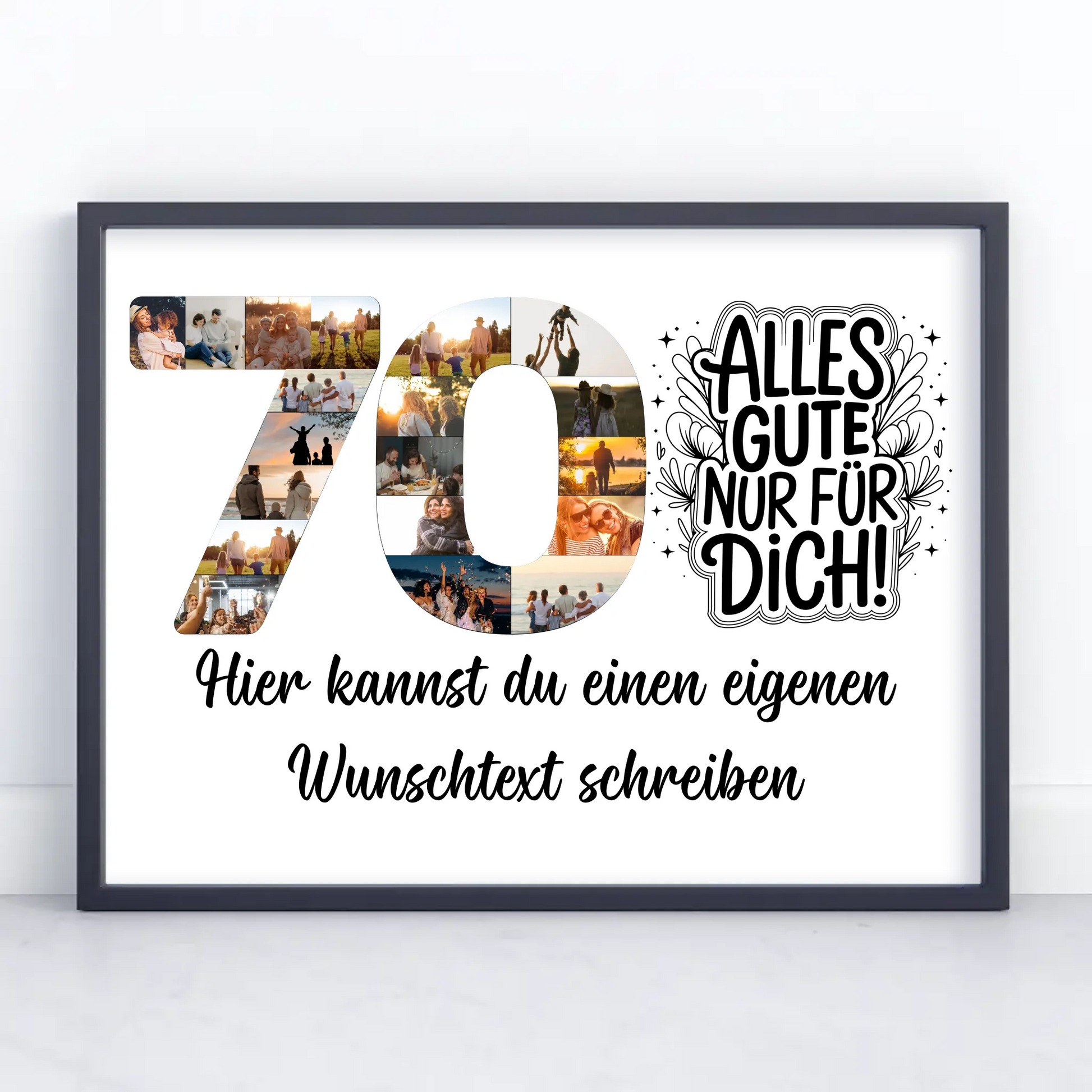 Feiere den 70. Geburtstag mit unserem einzigartigen 'Personalisiertes Poster Wunschtext 70 Geburtstag Alles Gute'. Dieses besondere Geschenk lässt sich ganz nach Deinen Wünschen gestalten und wird garantiert zum Highlight der Feier! Du kannst Deinen individuellen Spruch oder Wunschtext auswählen und aus über 20+ Fotos sowie einem Hintergrundbild wählen, um das Poster wirklich persönlich zu machen.