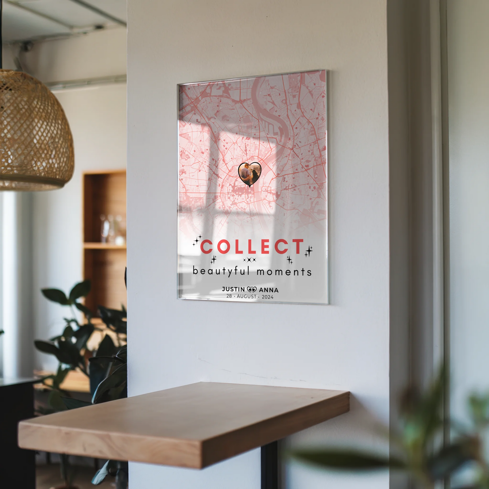 Du hast die Möglichkeit, das Acrylglas Bild ganz nach Deinen Vorstellungen zu gestalten. Wähle eine Karte mit einem besonderen Ort – vielleicht der Ort, wo alles begann – und füge die Namen der Paare sowie einen individuellen Spruch oder Wunschtext hinzu. So wird jedes Bild zu einem Unikat, das die Herzen höherschlagen lässt.