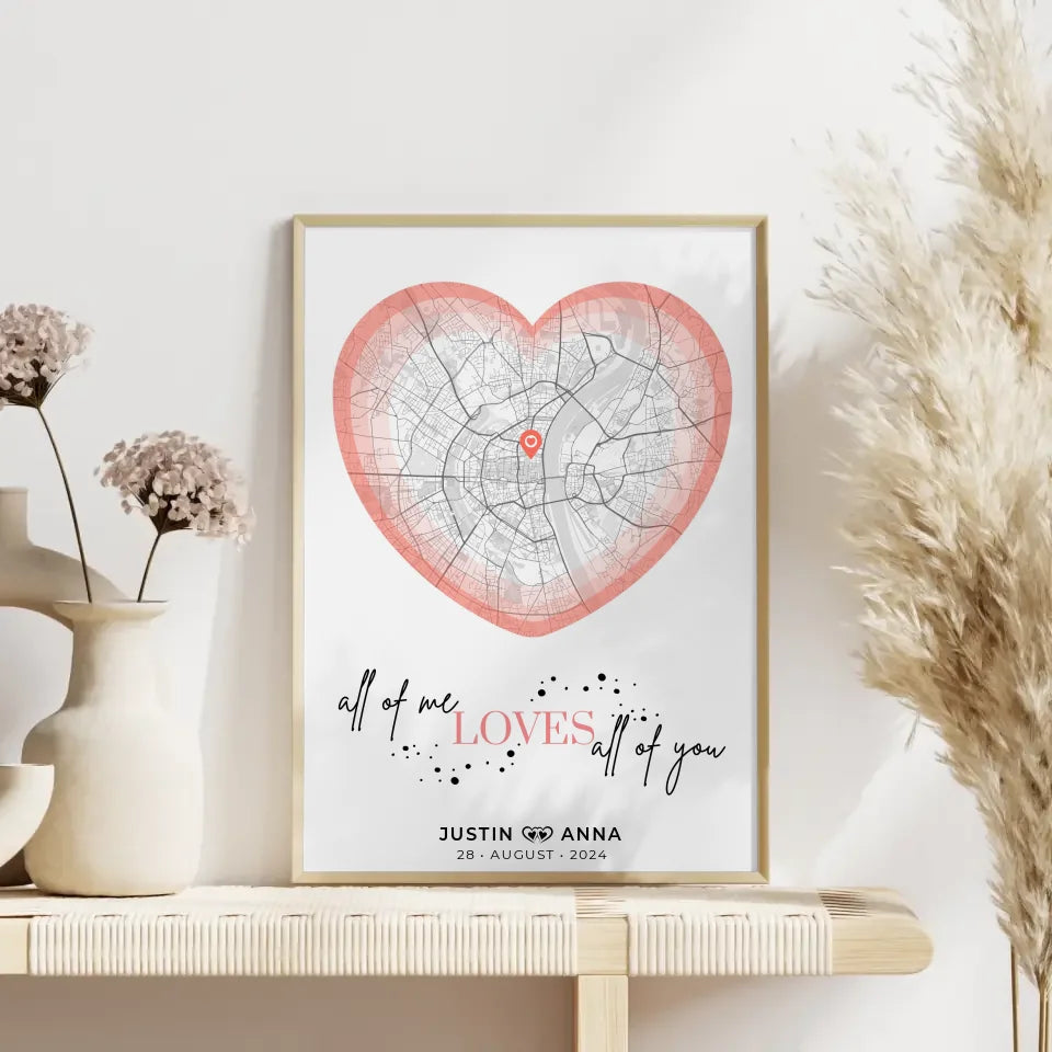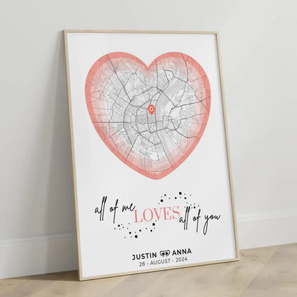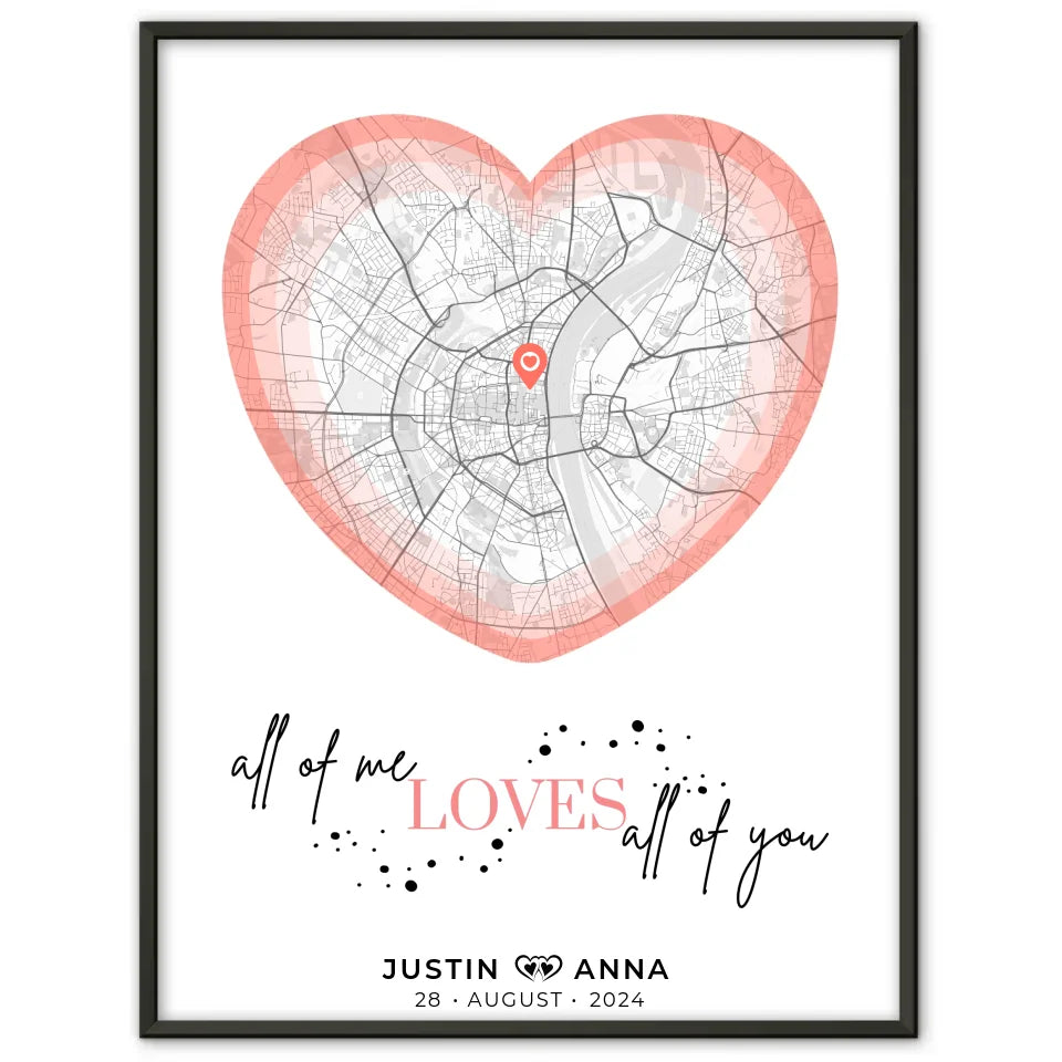 Personalisiertes Stadtkarten Poster für Paare Herz All Of Me Loves All Of You