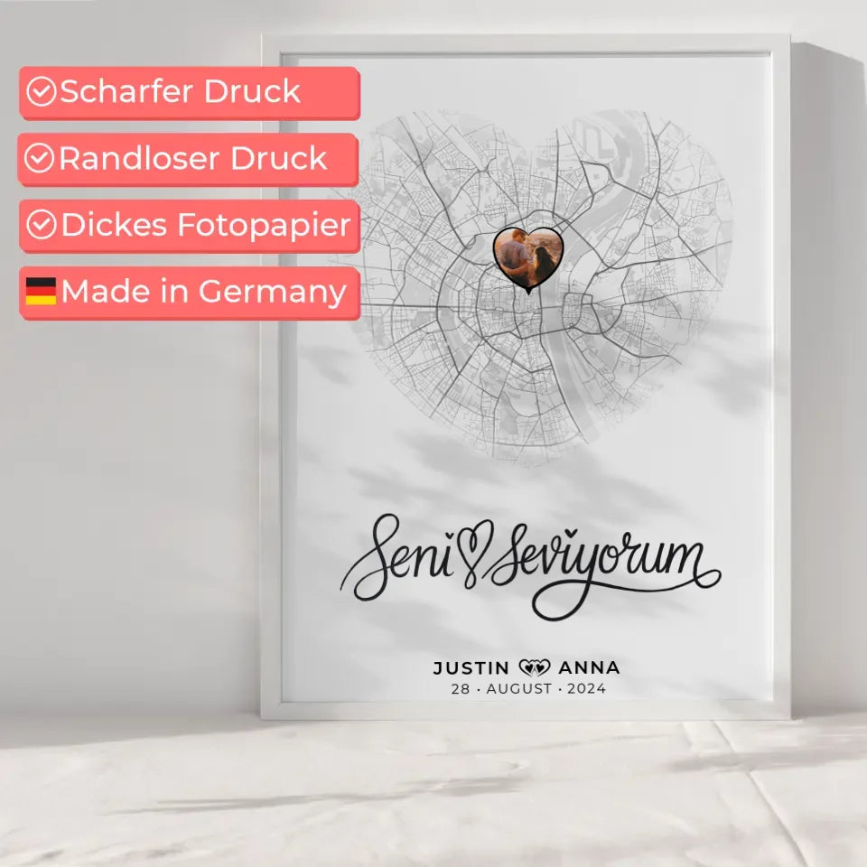 Personalisiertes Stadtkarten Poster für Paare Herz Seni Seviyorum