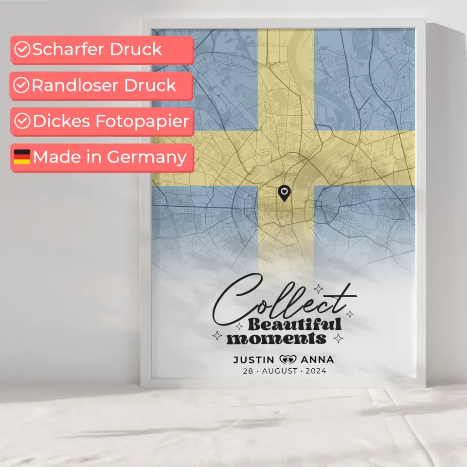 Du kannst das Poster ganz nach deinen Wünschen gestalten: Wähle ein persönliches Foto aus, füge eine Karte mit einem besonderen Ort hinzu, und vergiss nicht, die Namen des Paares sowie einen eigenen Spruch oder Wunschtext einzufügen. Das Design wird durch den schönen Spruch 'Collect Beautyful Moments' abgerundet, der die kostbaren Erinnerungen feiert – perfekt für Paare, die ihre Urlaubszeit in Schweden unvergesslich machen möchten.