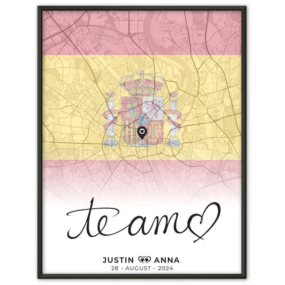 Überrasche deinen Partner mit einem einzigartigen und personalisierten Geschenk, das die schönsten Erinnerungen festhält: unser personalisiertes Stadtkartenposter für Paare, Urlaub Te Amo. Dieses stilvolle Poster vereint alles, was du dir wünschst: ein gemeinsames Foto, eine Stadtkartenmarkierung des besonderen Ortes, an dem ihr zusammen wart, sowie eure Namen und einen individuellen Spruch oder Wunschtext. Gestalte deinen ganz persönlichen Kunstwerk und erinnere dich immer wieder an unvergessliche Momente in Spanien oder anderen Traumzielen.