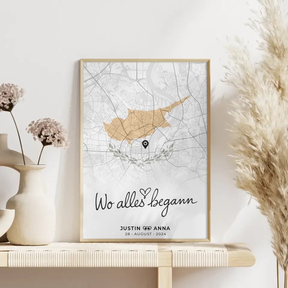 Wenn du nach einem besonderen Geschenk suchst, das individuell und persönlich ist, dann ist unser personalisiertes Stadtkartenposter genau das Richtige für dich. Schaffe mit diesem einzigartigen Design ein Erinnerungsstück, das euch immer an den Ort erinnert, wo alles begann: Zypern. Überrasche deinen Partner oder deine Partnerin mit einem Geschenk, das aus dem Herzen kommt und viel mehr als nur ein Poster ist.