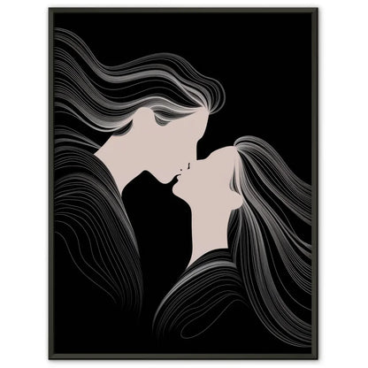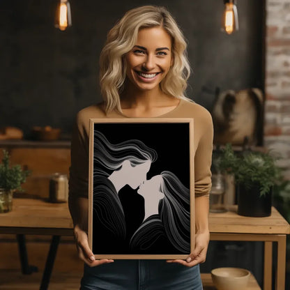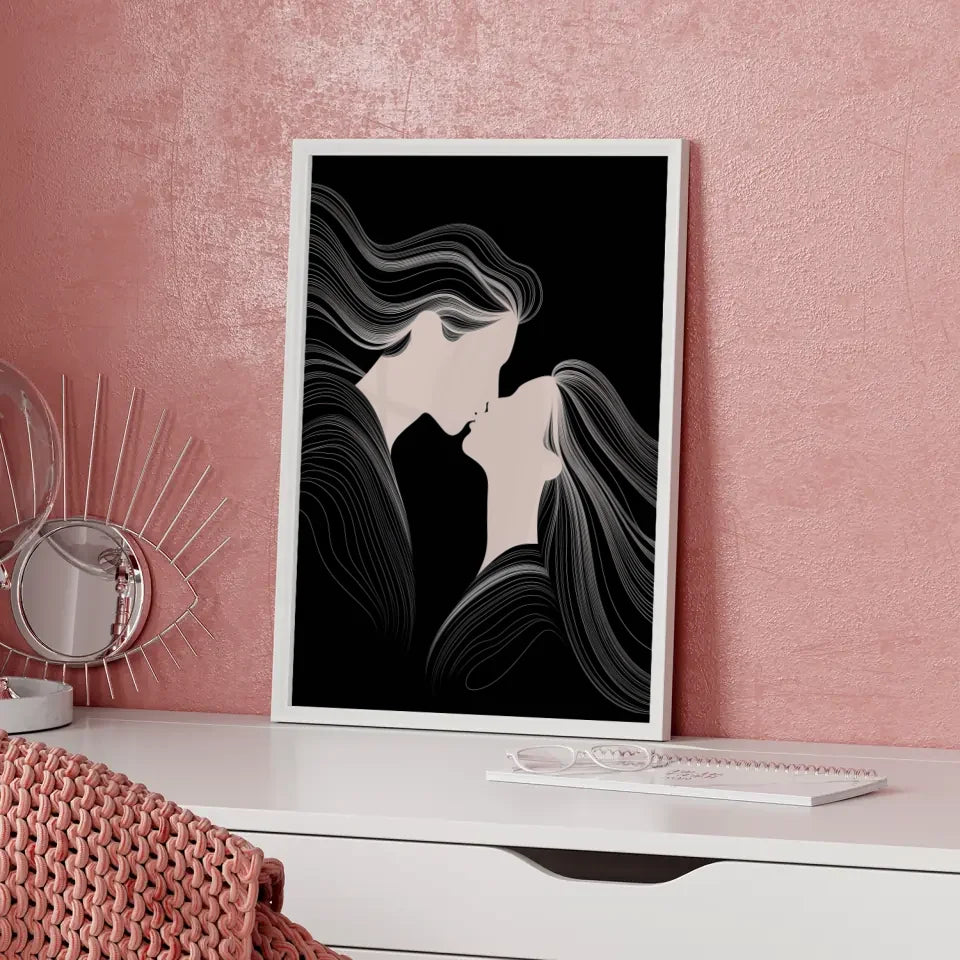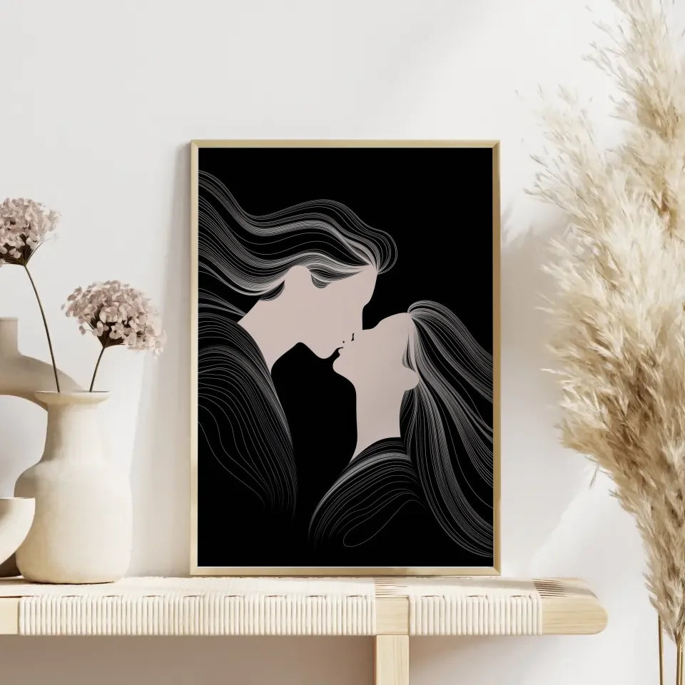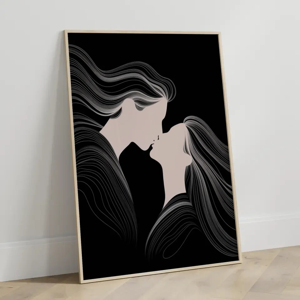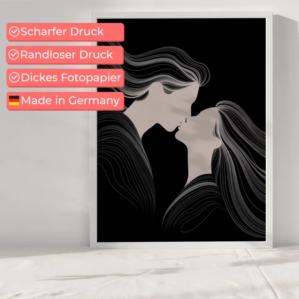 Entdecken Sie unser einzigartiges Poster abstrakte Silhouetten von Mann und Frau, das mit seinem zeitgenössischen Design eine besondere Atmosphäre in jeden Raum bringt. Dieses Kunstwerk gehört zur Kategorie Line Art und zeigt eine eindrucksvolle Illustration zweier Profilsilhouetten, die sich beinahe küssen. Die Verwendung von komplexen weißen Konturlinien, die an fließendes Haar oder Wellen erinnern, schafft ein faszinierendes Spiel von Tiefe und Bewegung. Besonders der kontrastreiche schwarze Hintergrund lässt die Figuren hervorstechen und zieht sofort alle Blicke auf sich.