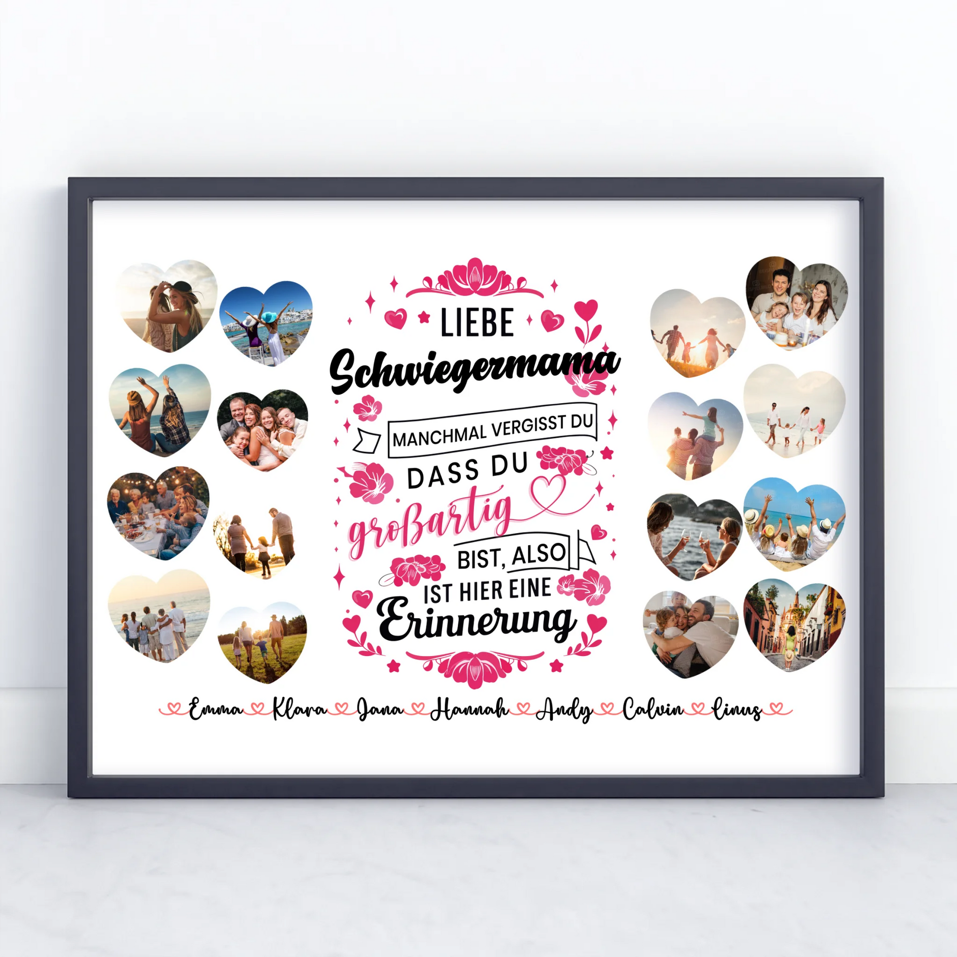 Du kannst bei diesem schönen Design 16 Fotos & 20 Namen ganz individuell personalisieren.