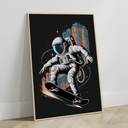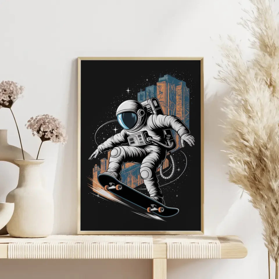 Poster mit Astronauten und Kickflip in urbanem Weltraumdesign