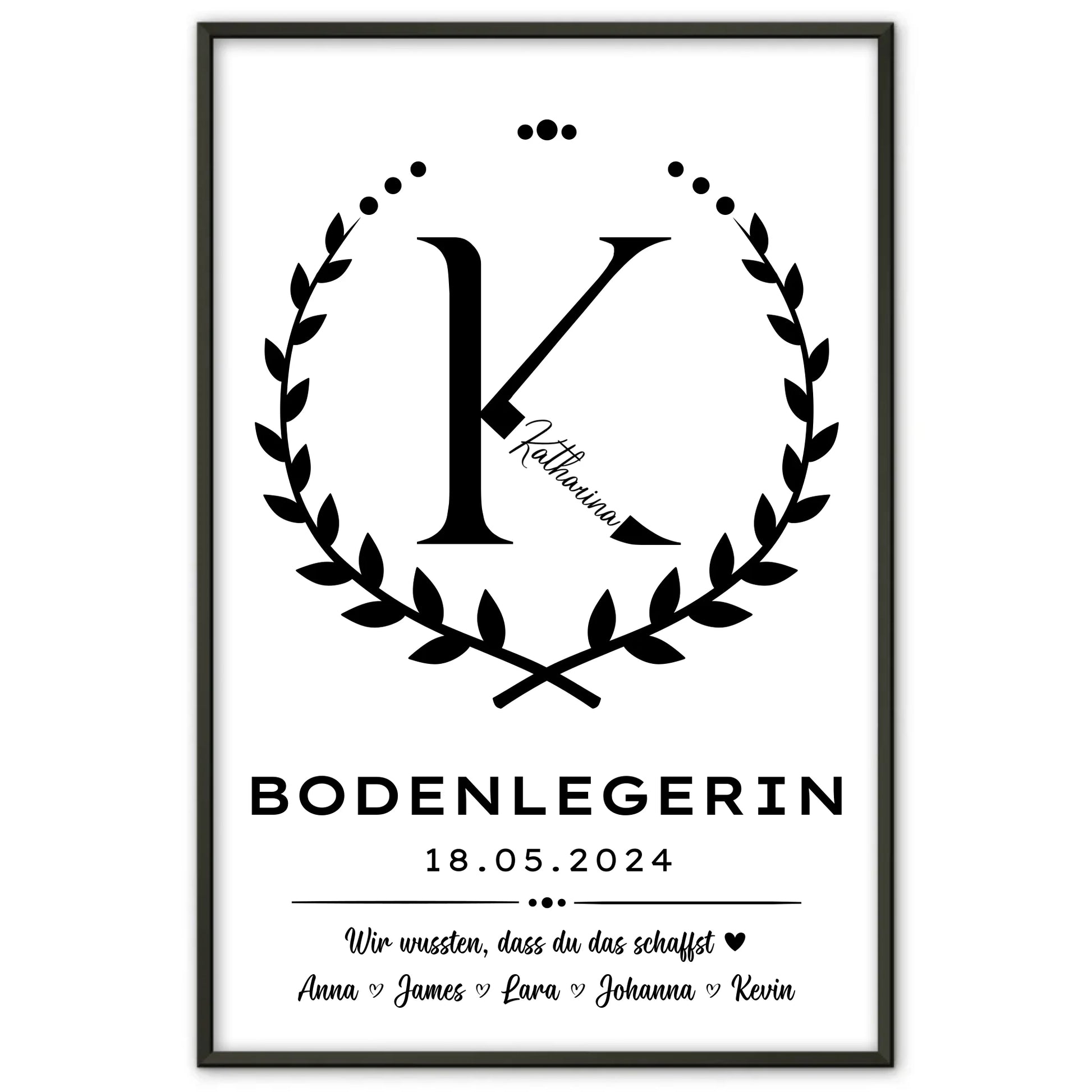 Das Poster kannst du ganz einfach mit dem Initial Buchstaben, dem Datum des Ausbildungsabschlusses und einem Wunschtext personalisieren. So wird aus einem schönen Präsent ein ganz persönliches Andenken, das die Bodenlegerin stolz an ihre Leistung erinnert. Ob als Abschiedsgeschenk oder zur Feier des Meilensteins – dieses Geschenk Abschluss Ausbildung trifft immer ins Schwarze.