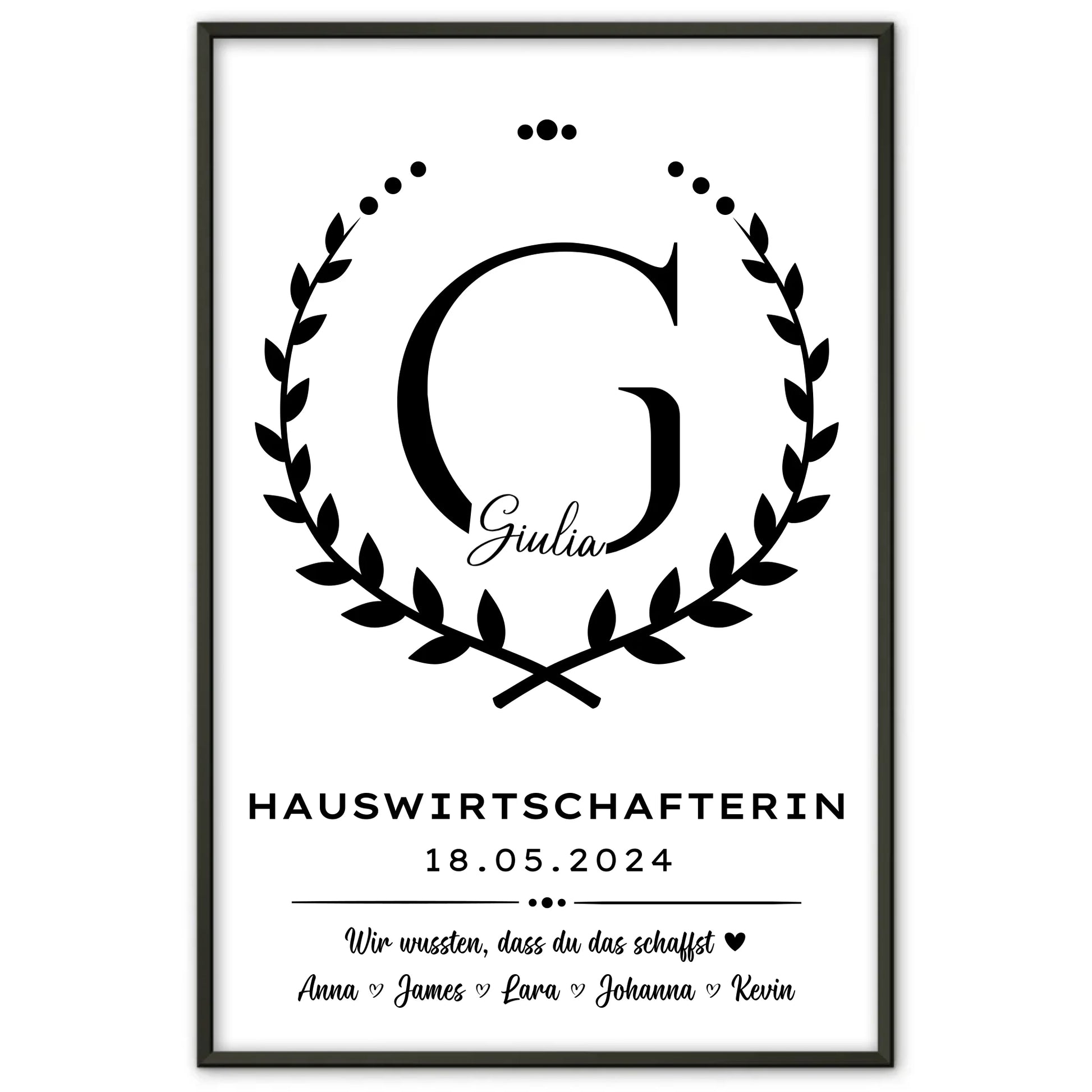 Du suchst ein einzigartiges und persönliches Ausbildungsabschluss Geschenk für eine Hauswirtschafterin? Unser Poster Ausbildungsabschluss Geschenk Hauswirtschafterin ist genau das Richtige für dich! Dieses individuell gestaltbare Poster kannst du mit dem Initial Buchstaben, dem Datum und deinem Wunschtext personalisieren, sodass es zu einem ganz besonderen Andenken wird. Ob als Geschenk Abschluss Ausbildung oder als liebevolle Überraschung zum Abschied – dieses Poster ist ideal, um den erfolgreichen Abschluss der Ausbildung stilvoll zu feiern.