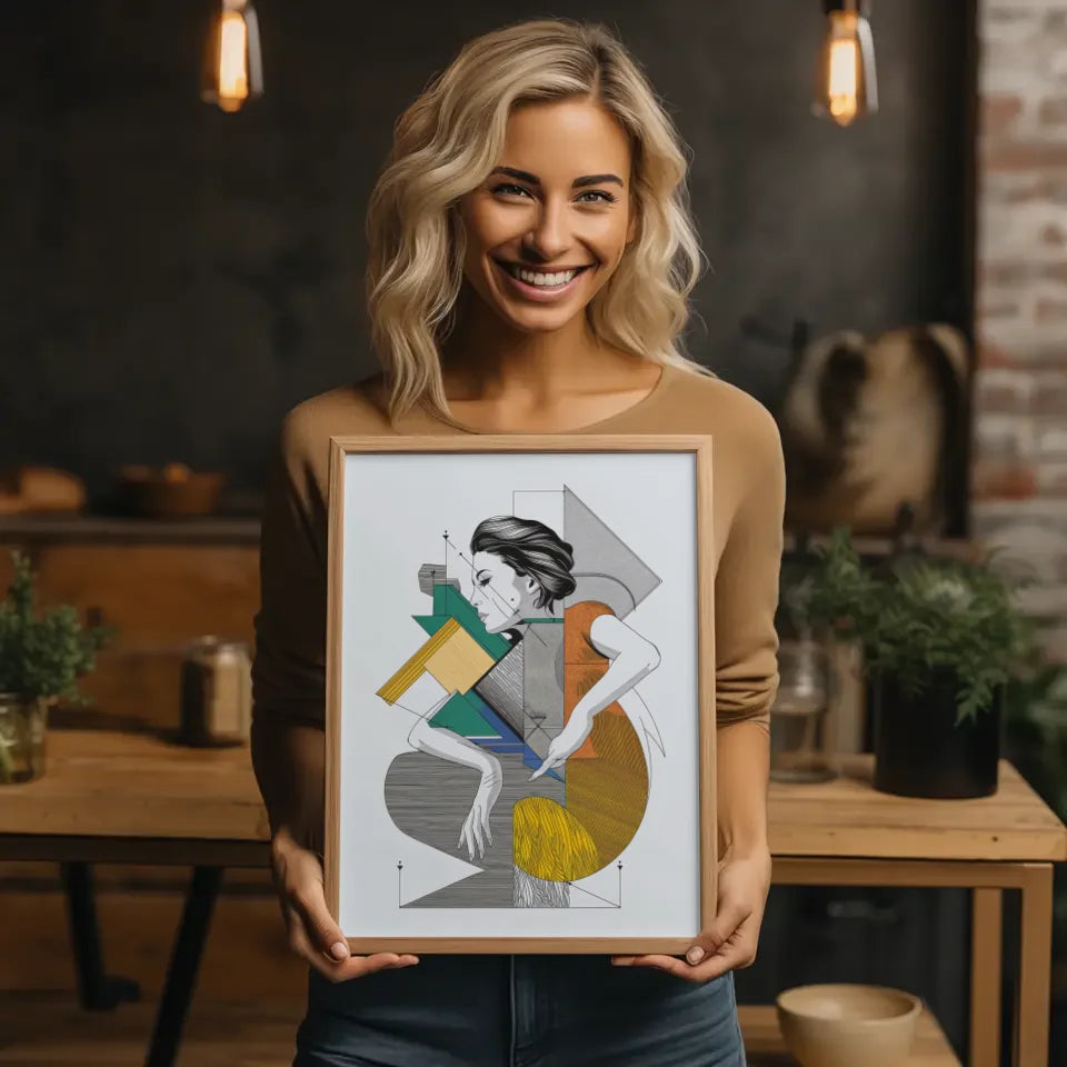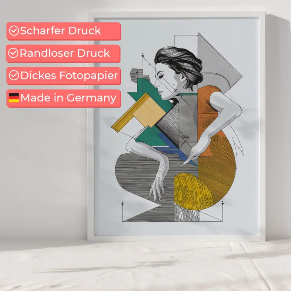 Bringen Sie mit unserem faszinierenden Poster Bauhaus Federillustration weibliche Figur mit geometrischen Formen ein Stück moderne Kunst in Ihr Zuhause. Diese eindrucksvolle Illustration ist nicht nur ein Blickfang, sondern auch eine Hommage an den Bauhaus-Stil, der durch die meisterhafte Kombination von einer weiblichen Figur und komplizierten geometrischen Formen besticht. Jedes Detail dieser Illustration wurde mit Sorgfalt ausgearbeitet, um Texturen und Farben harmonisch zu vereinen und die Maserung und Muster, die die Figur umgeben, widerzuspiegeln.