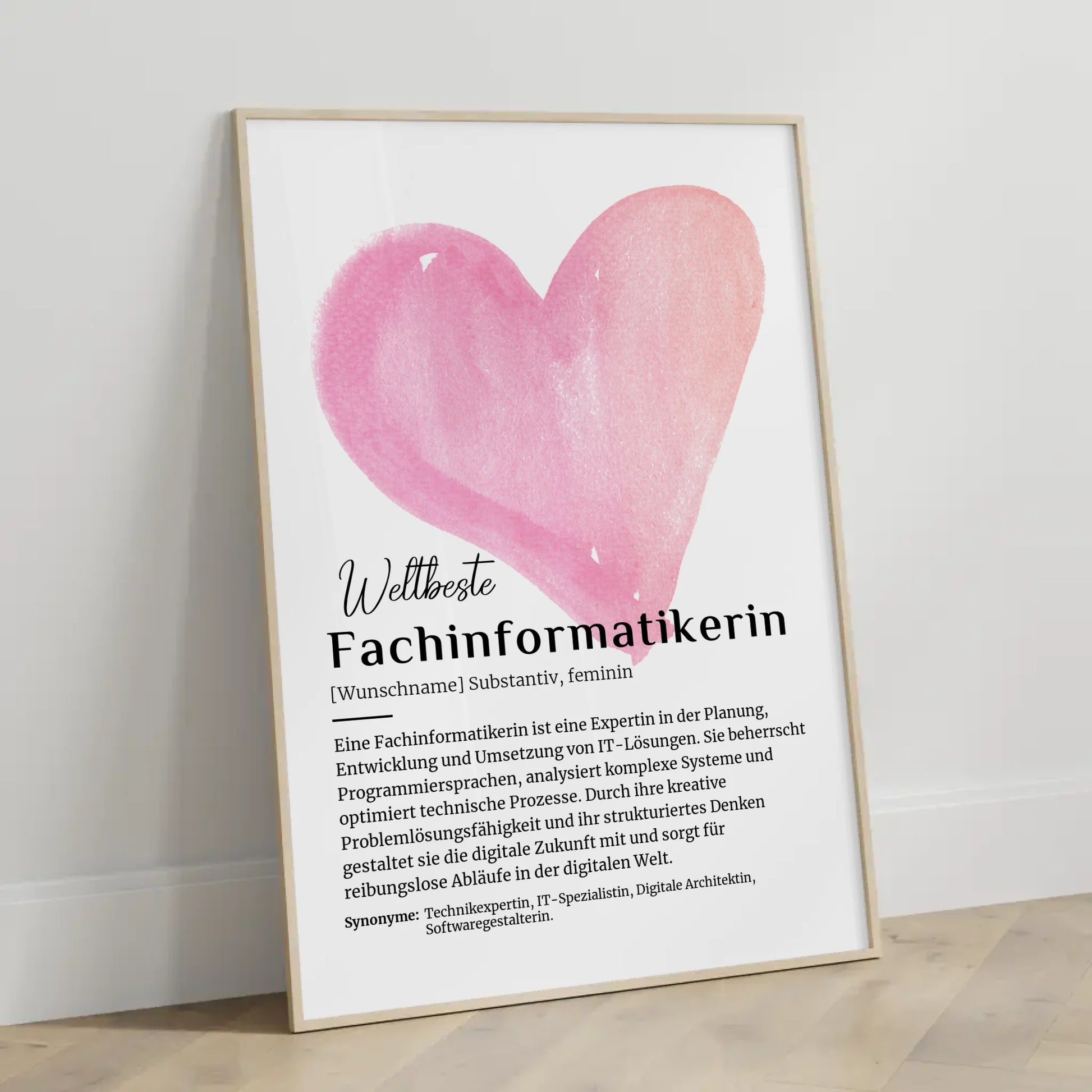 Mache jemandem eine Freude und bestelle noch heute dein personalisiertes Poster! Es ist nicht nur ein Hingucker, sondern auch ein Ausdruck deiner Wertschätzung für die Arbeit einer talentierten Fachinformatikerin.