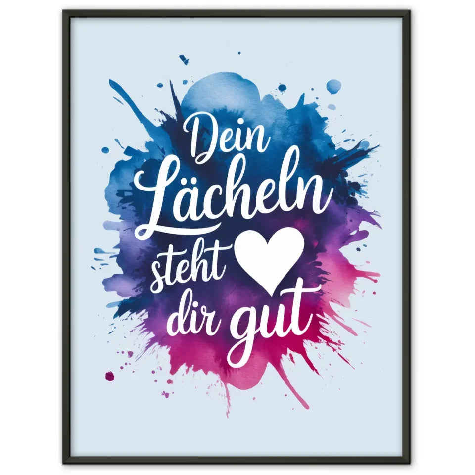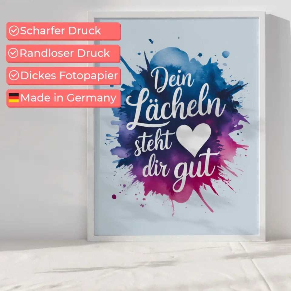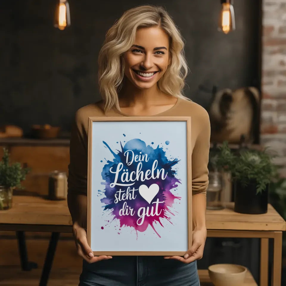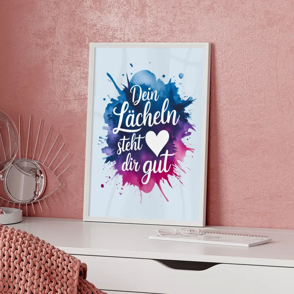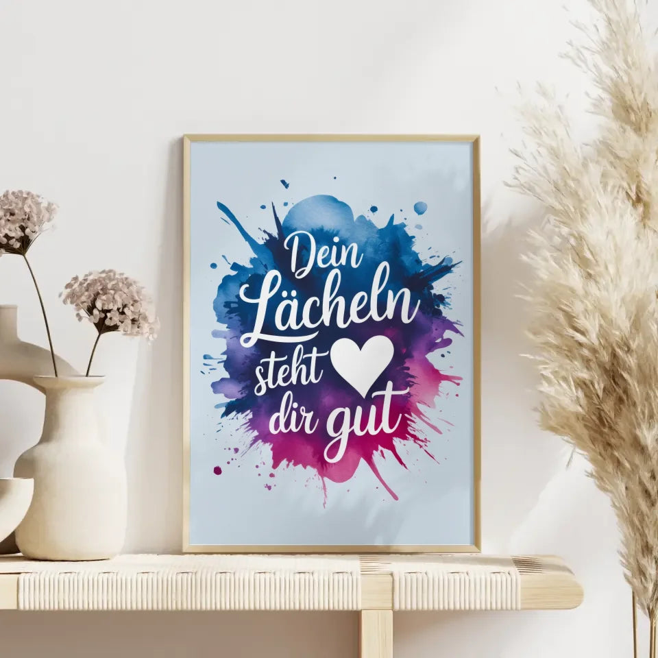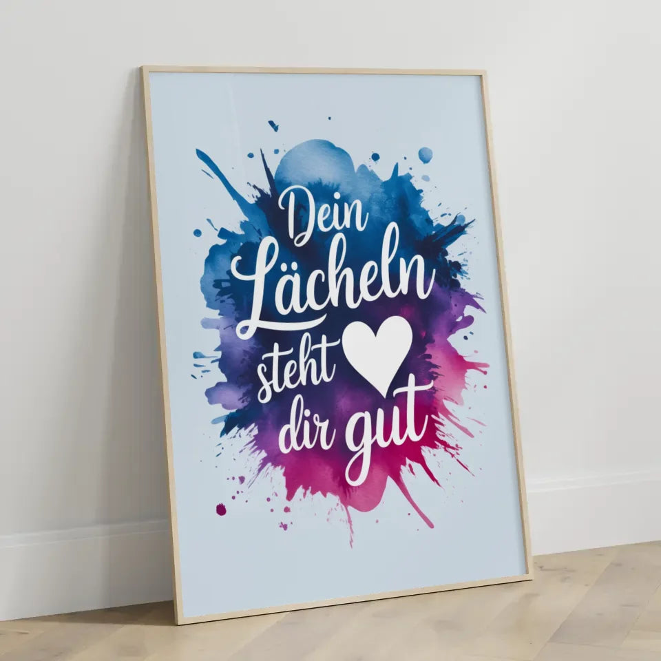 Entdecken Sie unser einzigartiges Poster 'Dein LĂ€cheln steht dir gutâ, ein zeitloses Kunstwerk, das jedem Raum eine fröhliche Note verleiht. Dieses liebevoll gestaltete Spruchbild beeindruckt mit einer Aquarell-Splash-Illustration, die sowohl modern als auch ansprechend ist. Das sanfte Blau des Textes, der in einer eleganten kursiven Schriftart gehalten ist, harmoniert perfekt mit dem schimmernden Farbverlauf aus Blau, Lila und Rosa des Aquarellspritzers.