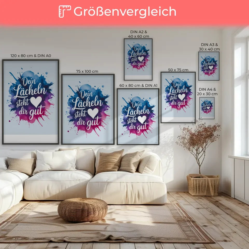 Bringen Sie Farbe und Lebensfreude in Ihre WĂ€nde mit unserem Poster 'Dein LĂ€cheln steht dir gutâ. Erfreuen Sie sich an der Kombination aus kĂŒnstlerischer Gestaltung und motivierenden Worten, die jeden Tag aufs Neue ein LĂ€cheln hervorrufen. Ideal als Geschenk oder zur Eigenverschönerung.