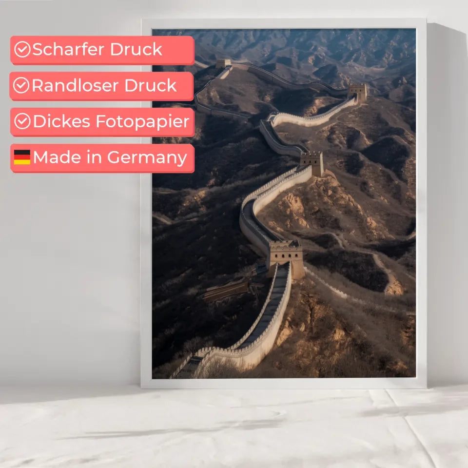 Durch die hochwertige Druckqualität kommt jedes Detail der Chinesischen Mauer perfekt zur Geltung, sodass Sie die Faszination dieses historischen Bauwerks jederzeit genießen können. Warten Sie nicht länger und sichern Sie sich jetzt Ihr Poster der Chinesischen Mauer, um Ihrem Wohnraum eine persönliche Note zu verleihen.