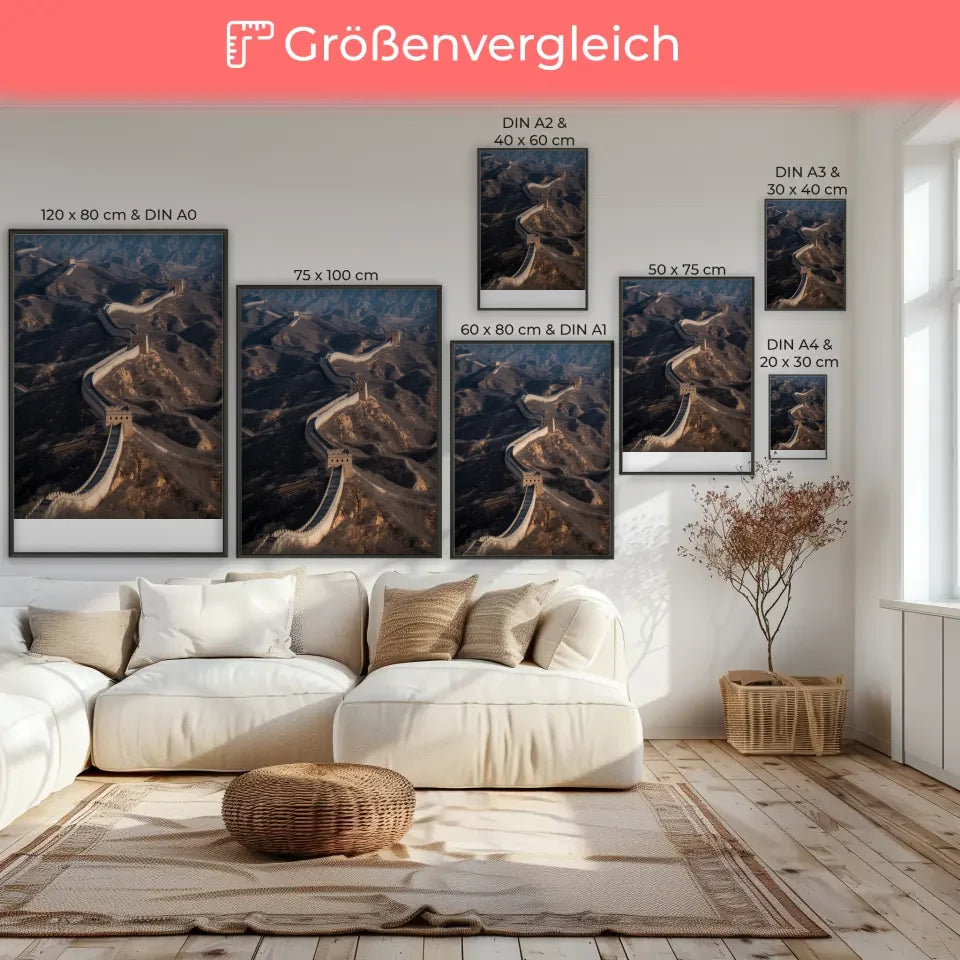 Bringen Sie mit diesem einzigartigen Poster ein Stück chinesischer Kultur in Ihre vier Wände. Ob im Wohnzimmer, im Büro oder im Eingangsbereich – dieses Luftbild wird garantiert zum Mittelpunkt Ihrer Einrichtung. Gönnen Sie sich das Poster der Chinesischen Mauer und verwandeln Sie Ihre Räume in ein inspirierendes Ambiente voller Geschichte und Natur.