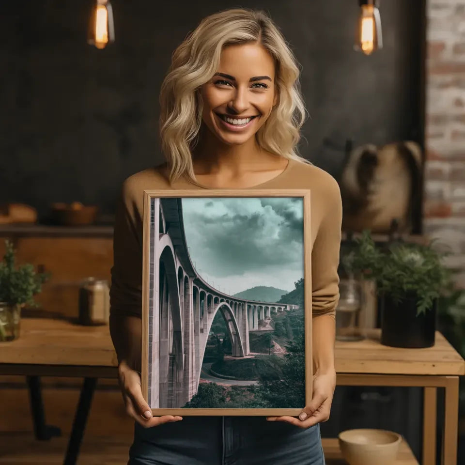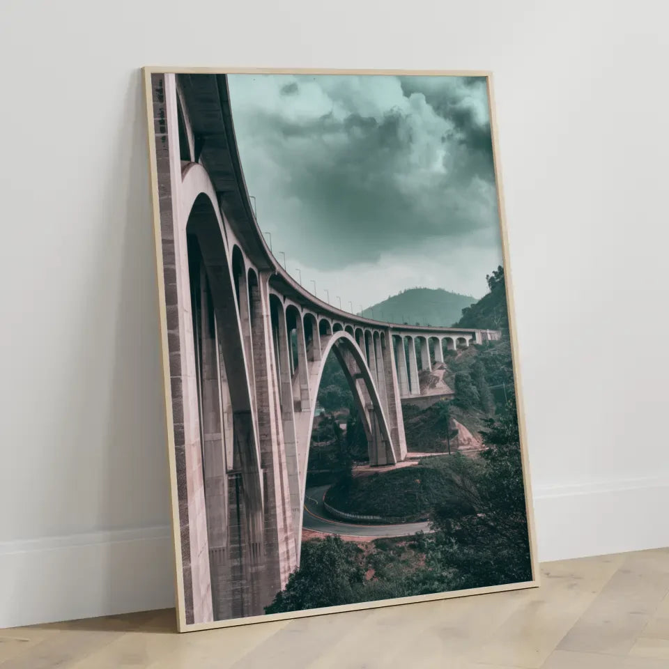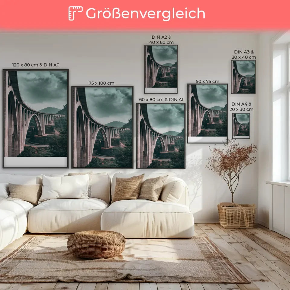 Verleihen Sie Ihrem Wohnraum einen Hauch von Exotik mit unserem beeindruckenden Poster der Nine Arches Bridge in Sri Lanka. Dieses Kunstwerk zeigt die atemberaubende Architektur der berühmten Brücke, die auch als 'Brücke im Himmel“ bekannt ist. Der faszinierende Blickwinkel hebt die eleganten, geschwungenen Steinbögen der Brücke hervor und lässt die harmonische Verbindung zur beeindruckenden Natur nicht unberührt. Umgeben von satten, grünen Hügeln und einer kurvenreichen Straße, fängt dieses Poster die natürliche Schönheit Sri Lankas perfekt ein. Die dramatisch bewölkten Himmel und die dunklen Wolken verleihen dem Bild eine mystische Atmosphäre, die jeden Raum bereichert. Ideal für Architektur-Liebhaber und Naturliebhaber gleichermaßen, ist dieses Poster die perfekte Dekoration für Ihr Zuhause oder Ihr Büro. Entdecken Sie die magische Anziehungskraft der Nine Arches Bridge und holen Sie sich ein Stück Sri Lankas in Ihre vier Wände!