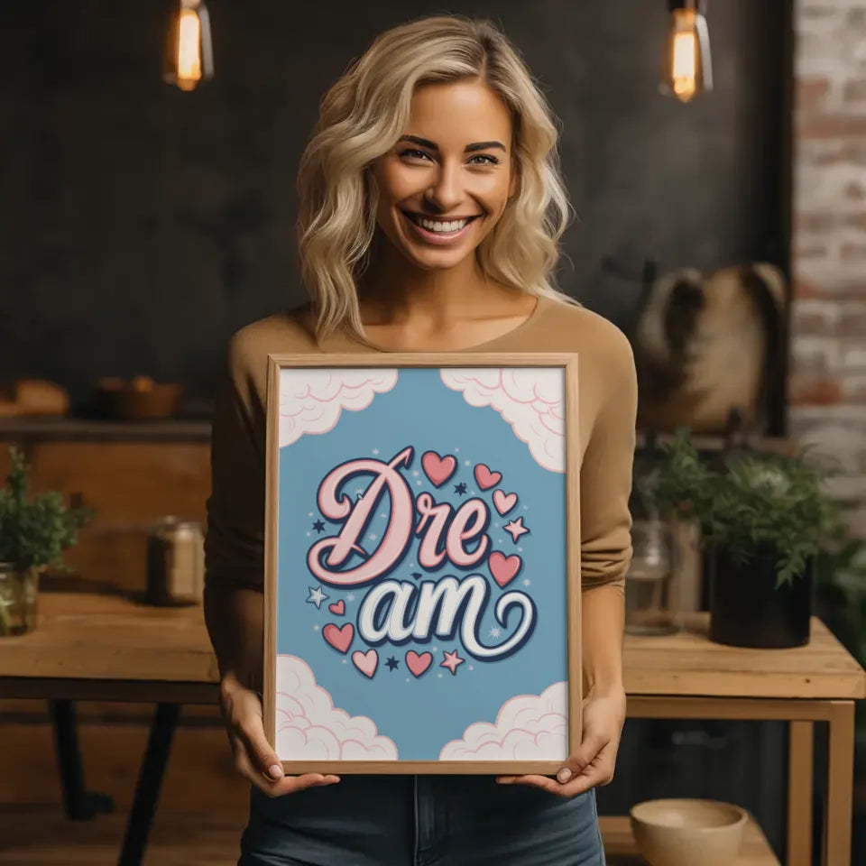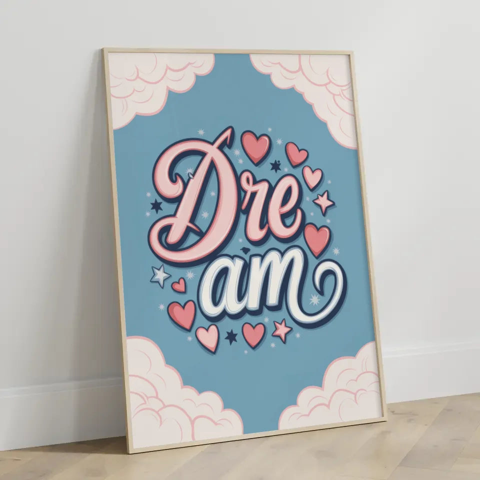 Entdecken Sie unser bezauberndes Poster Dream, das mit einem charmanten Typografie-Design begeistert. Dieses exquisite Poster ist perfekt für jeden Raum, der eine liebevolle und verträumte Atmosphäre schaffen soll. Auf dem hellblauen Hintergrund schweben flauschige, weiße Wolken, während der Text 'Dream“ in sanften Rosa- und Blautönen in eleganter Kursivschrift erstrahlt.