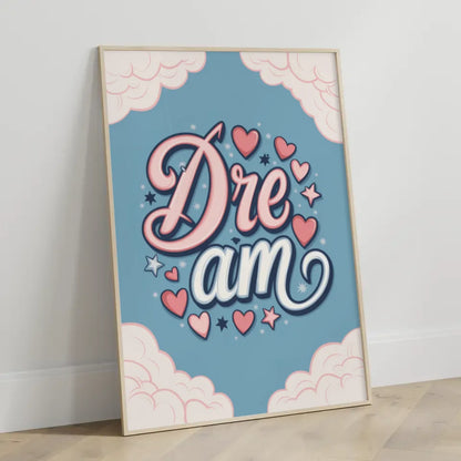 Poster Dream mit Herzen und Sternen auf hellblauem Hintergrund
