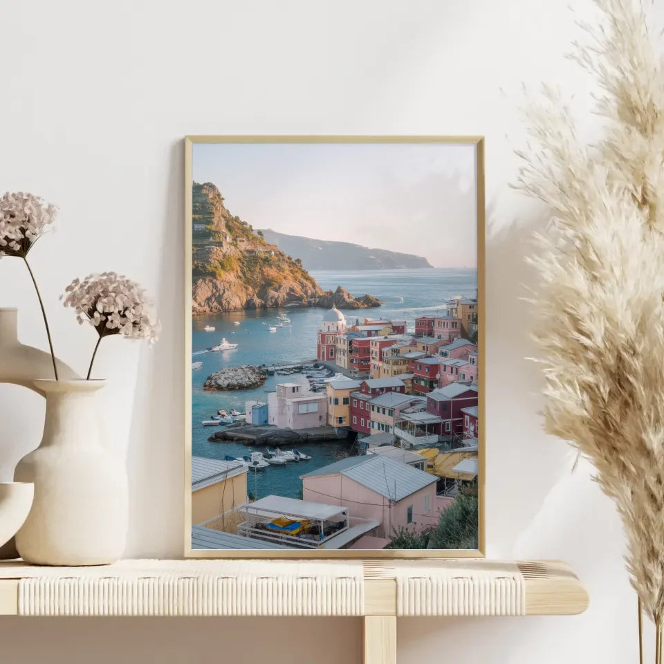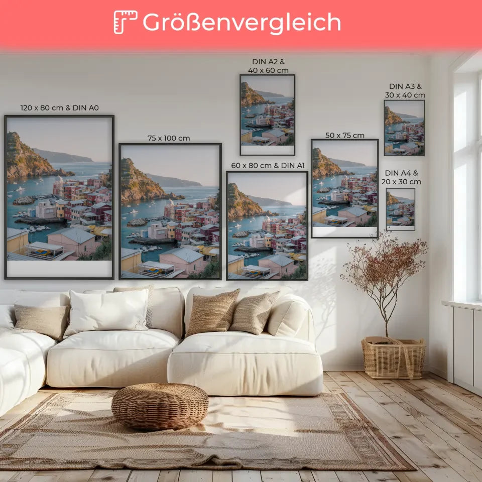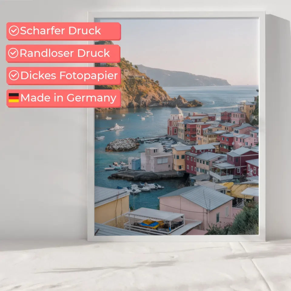 Das Poster fängt die entspannte Atmosphäre der Küstenstadt perfekt ein. Das azurblaue Meer, gesäumt von zahlreichen Booten, erzeugt ein urlaubsähnliches Feeling, während die ferne Landmasse am Horizont ein Gefühl von Entdeckung und Abenteuer vermittelt. Die warmen Sonnenstrahlen, die die Szene durchfluten, schaffen eine einladende Stimmung, die Ihr Zuhause aufhellt. Ob im Wohnzimmer, Schlafzimmer oder Büro, dieses Poster ist nicht nur ein Blickfang, sondern auch eine Quelle der Inspiration.