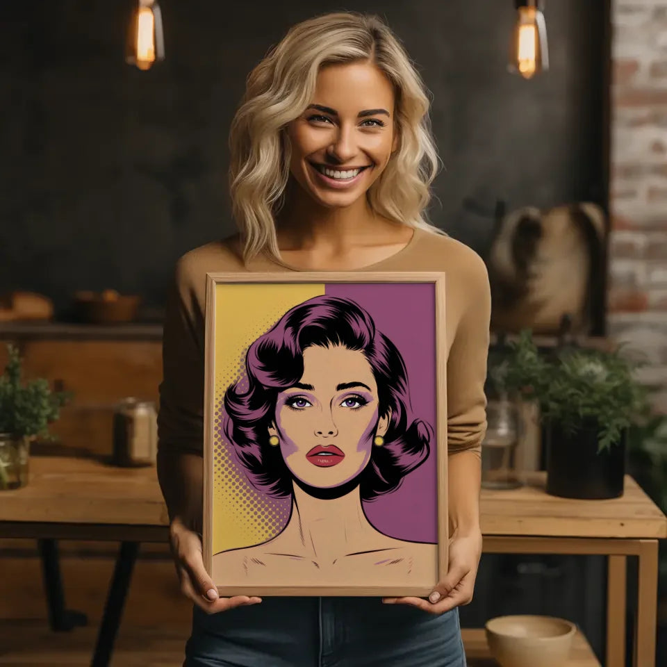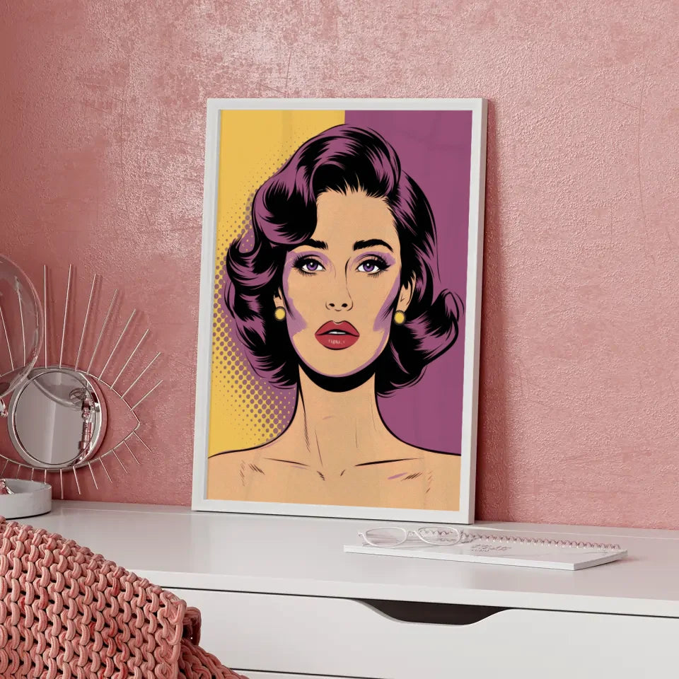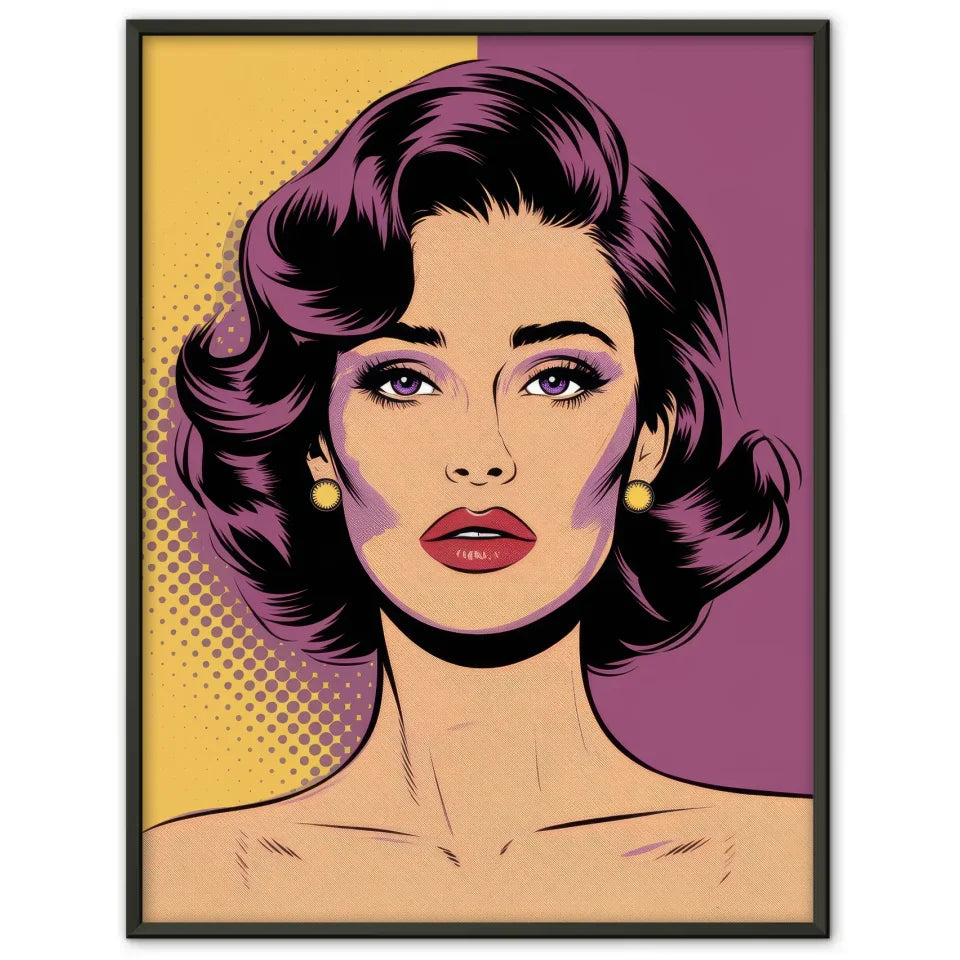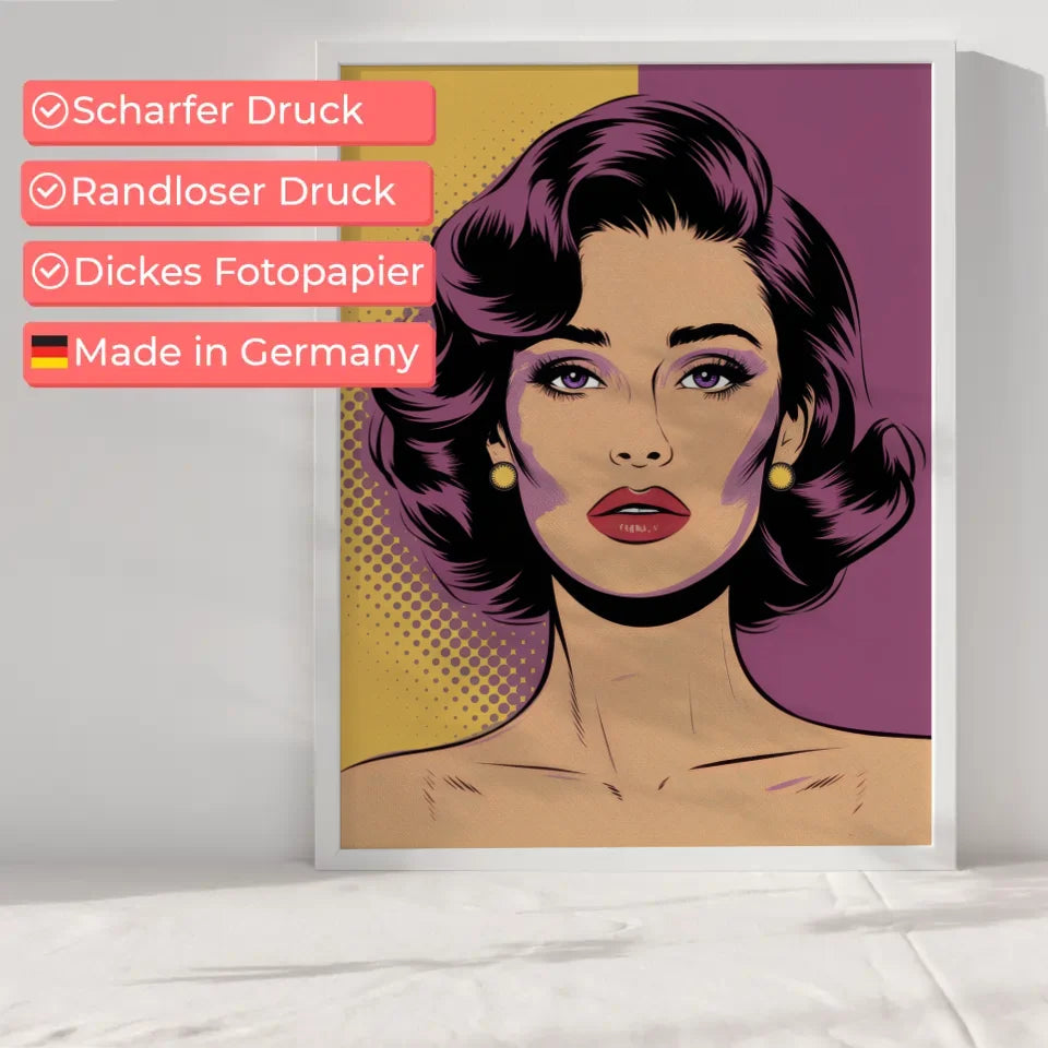 Bringen Sie Farbe und Stil in Ihr Zuhause mit unserem einzigartigen Poster einer modischen weiblichen Figur in leuchtenden Farben. Diese fesselnde Illustration ist ein wahrer Blickfang und verleiht jedem Raum eine kreative Note. Die Darstellung zeigt eine elegante Frau mit dunklem, wallendem Haar, kräftigen roten Lippen und faszinierenden lila Augen, die sofort ins Auge fallen. Das Poster wird durch einen lebhaften Hintergrund bereichert, der mit einem ausgeprägten Muster aus gelben und rosa Halbtonpunkten verziert ist und an eine Retro-Pop-Art-Ästhetik erinnert. Die harmonische Farbpalette in Rosa-, Lila- und Gelbtönen sorgt dafür, dass die zentrale Figur ungeteilte Aufmerksamkeit erregt und eine markante Präsenz ausstrahlt. Ob im Wohnzimmer, Schlafzimmer oder im kreativen Arbeitsbereich, dieses Poster verwandelt jede Wand in ein Kunstwerk und setzt stilvolle Akzente. Gestalten Sie Ihr Zuhause individuell mit diesem trendigen und außergewöhnlichen Wandbild und lassen Sie die Schönheit der Illustration für sich sprechen.